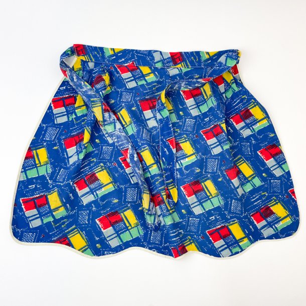 Blå vintage forklæde med mønster i klare farver, fiks lomme og bindebånd i taljen.