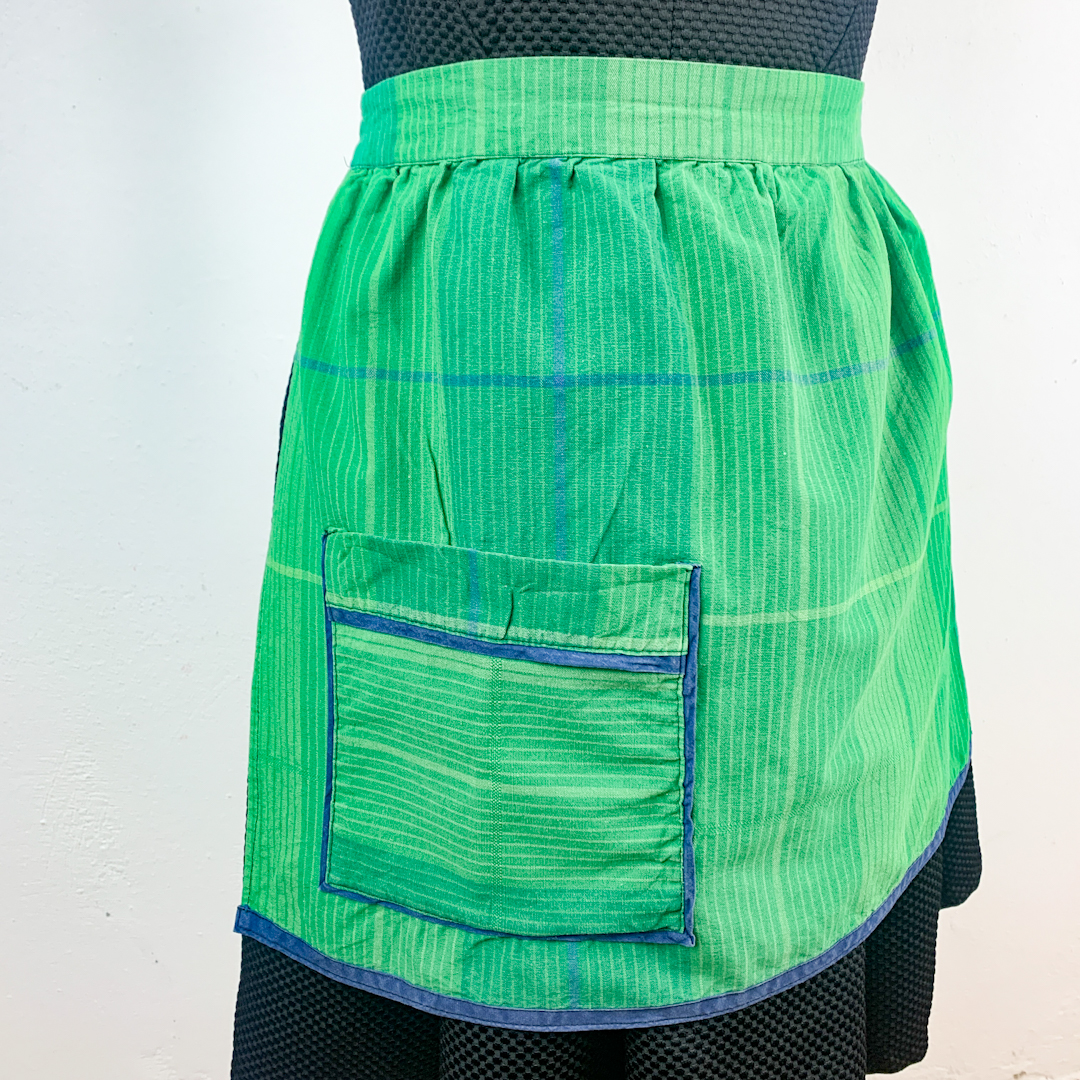 Flot retro forklæde fra 60’erne/70’erne i bomuld med grønne striber og mørkeblå kant.