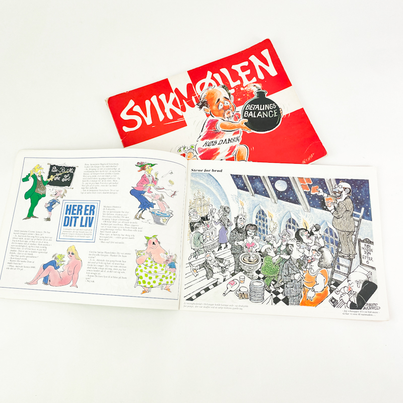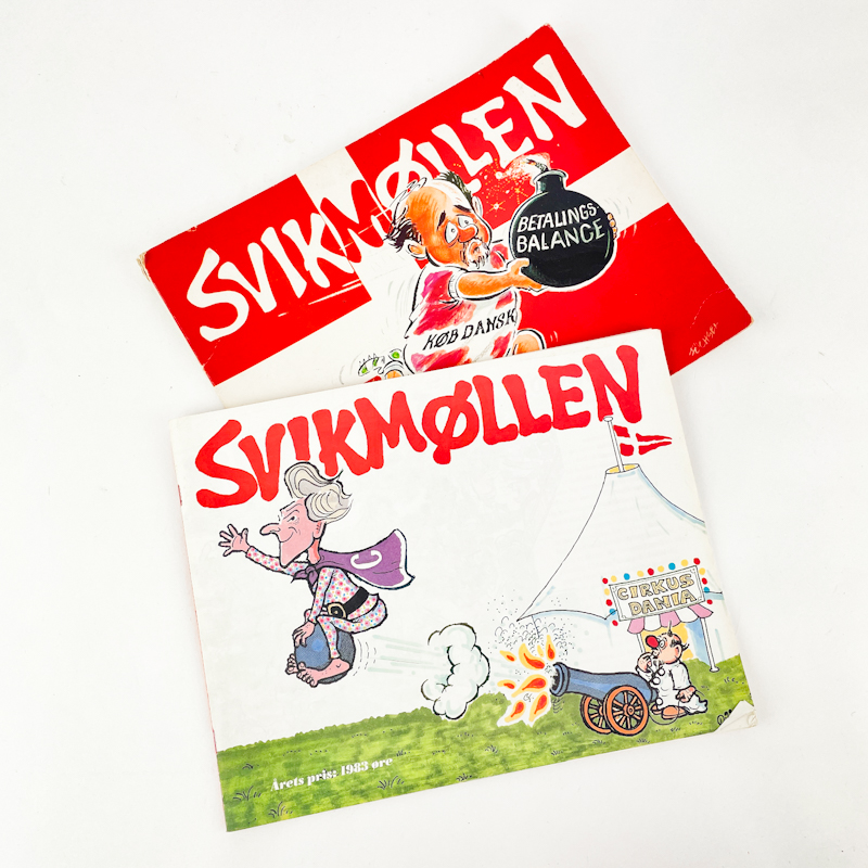 To originale Svikmøllen-hæfter i flot stand med farverige satiretegninger og klassiske politiske kommentarer.
