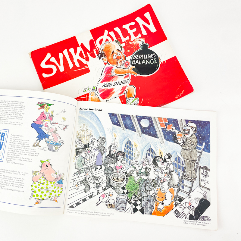 Et charmerende indblik i dansk satirehistorie med mange illustrerede opslag og detaljerige tegninger.