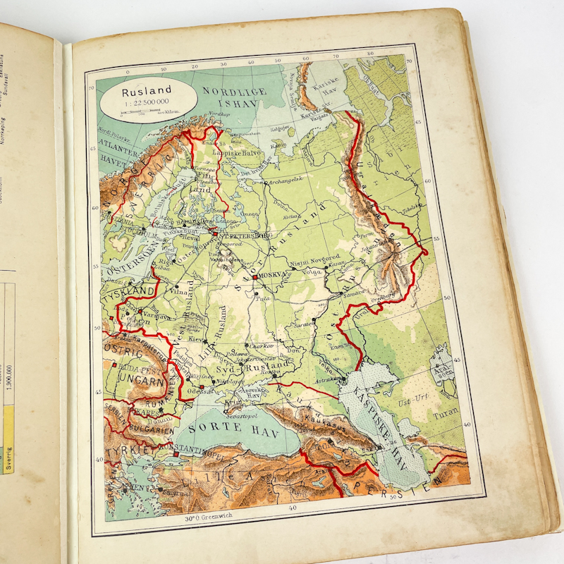 Originalt dansk skoleatlas udgivet i 1911 med farvelagte kort over Danmark, Europa og verden.