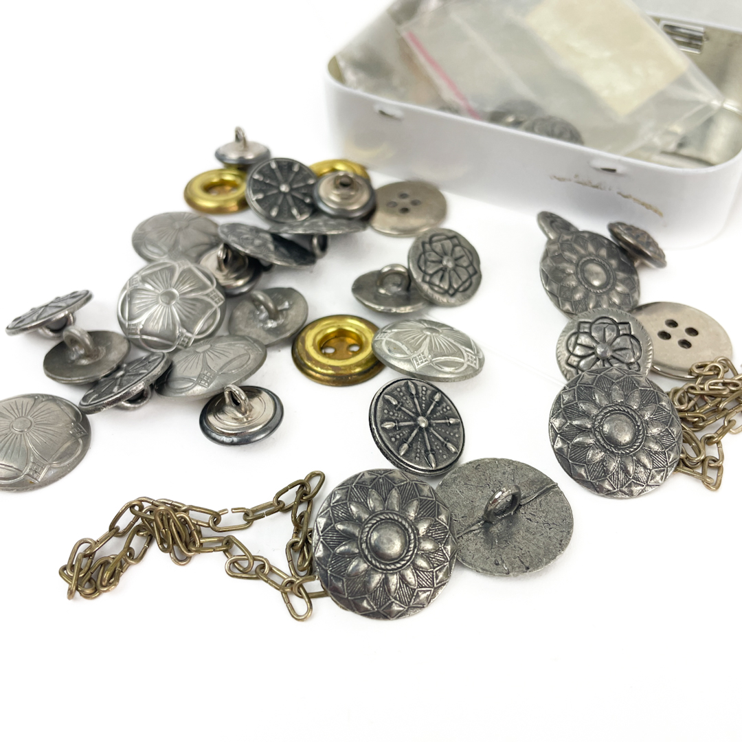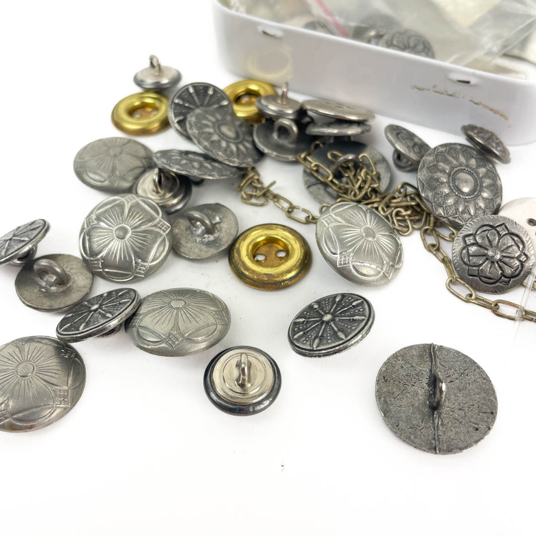 Smuk lille samling af gamle metalknapper i forskellige mønstre og størrelser.