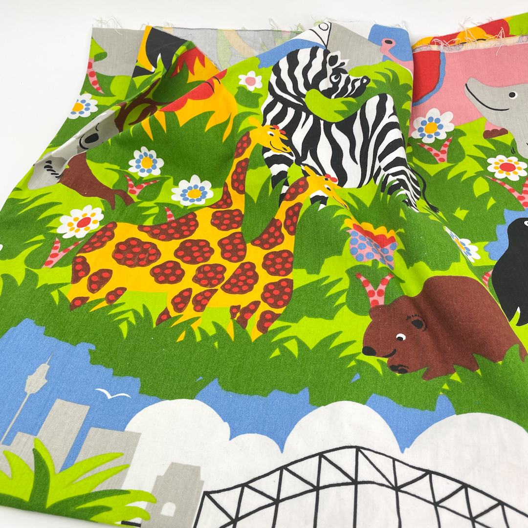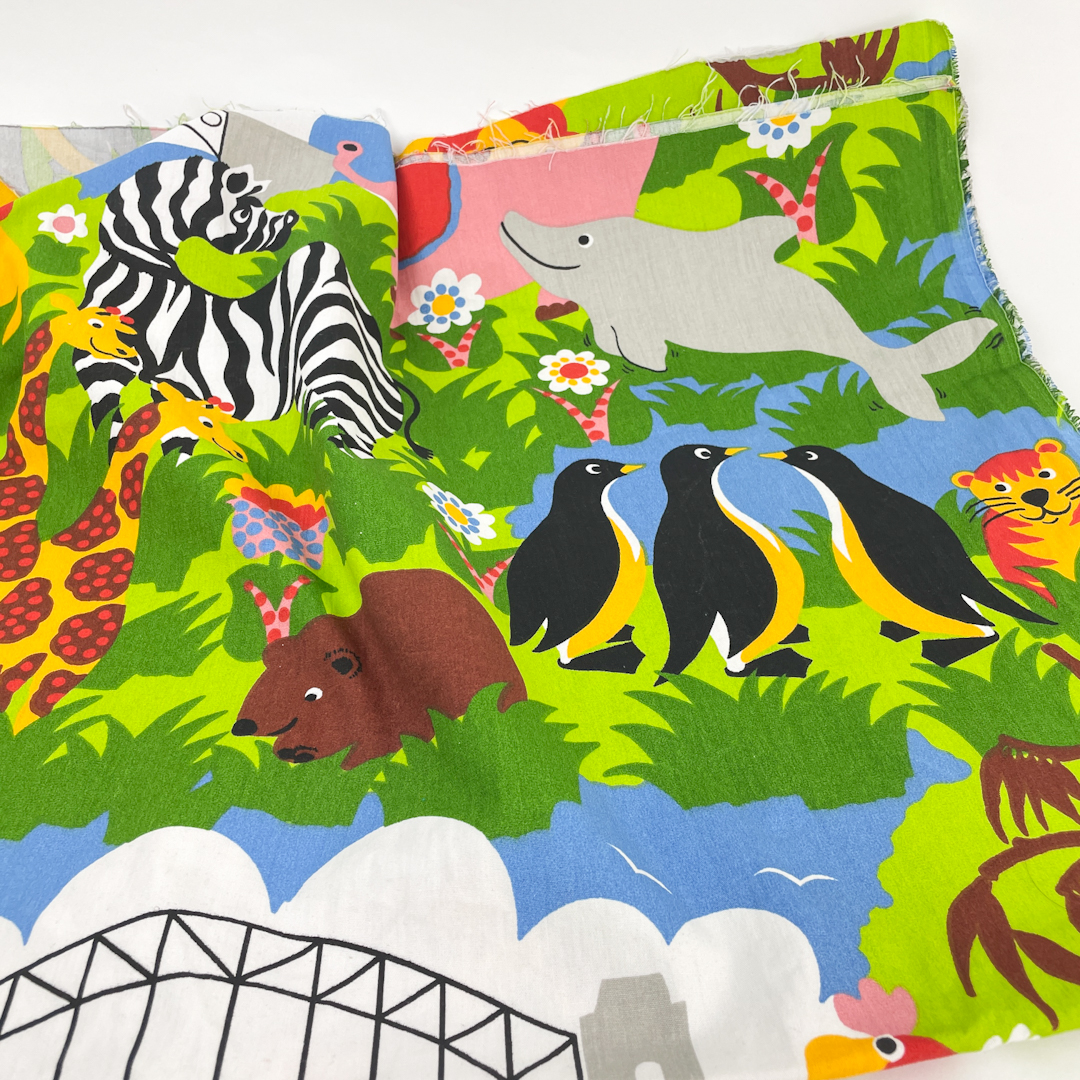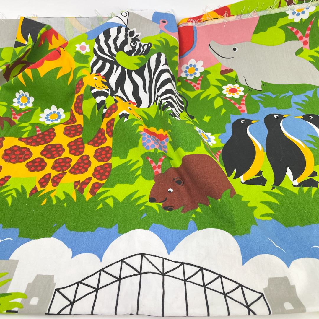 Herligt retro stofstykke i kraftig bomuld med farvestrålende motiv af dyr i junglen – blandt andet zebra, giraf, næsehorn og bjørn.