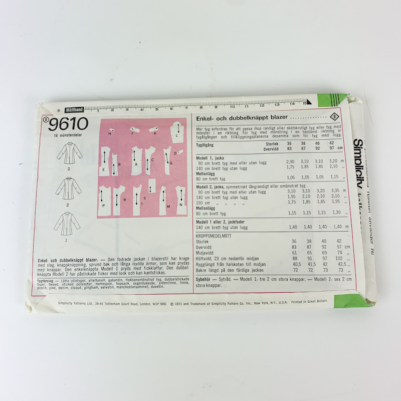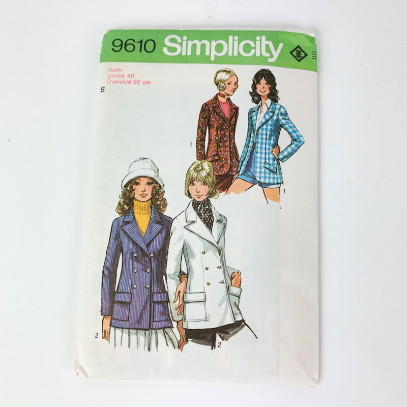 Originalt vintage symønster fra Simplicity til klassisk blazer med enkel eller dobbeltradet knaplukning.