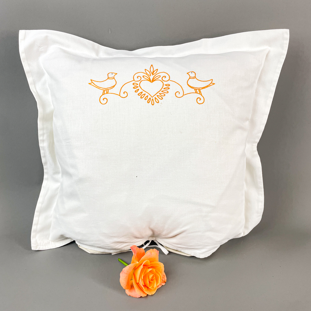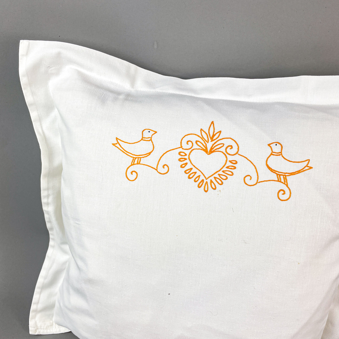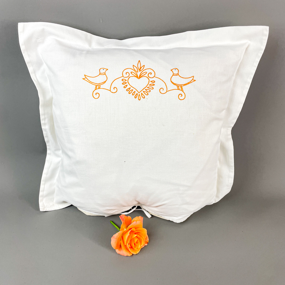 Pudebetrækket er pyntet med fint broderi i orange med hjerte og to fugle