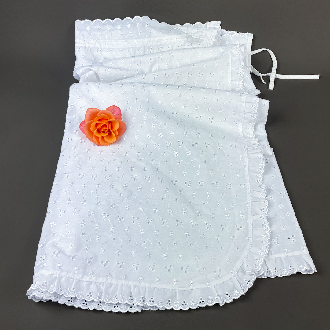 Den er dekoreret med fine blomsterbroderier og afsluttet med bølget blondekant.