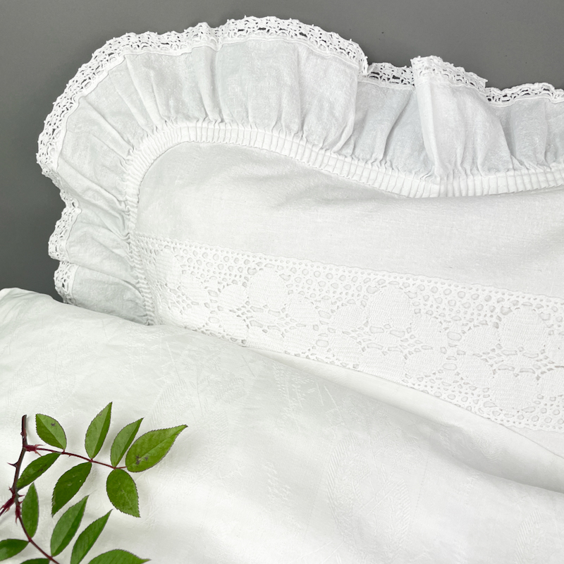 Smukt hvidt vintage babysengetøj i ren bomuld med bred flæsekant, dekorativ blonde og fint mellemværk på pudebetrækket.