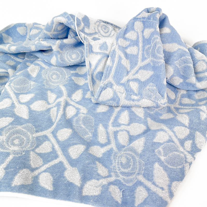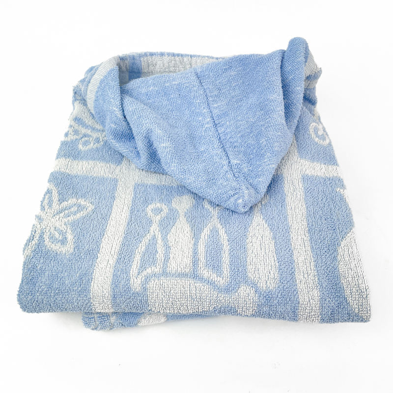 To fine retro babybadeslag i blød frotté med hætte, begge i lyseblå og hvid.