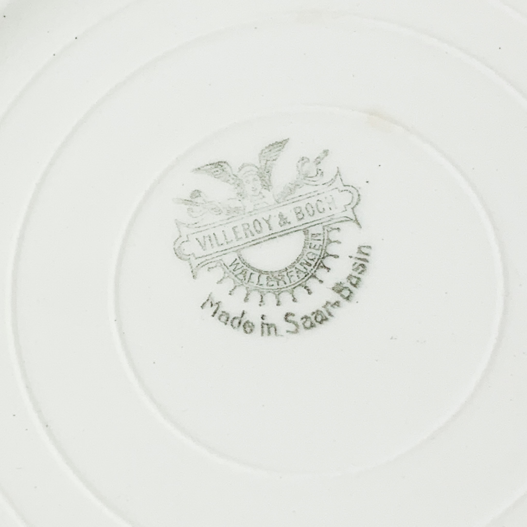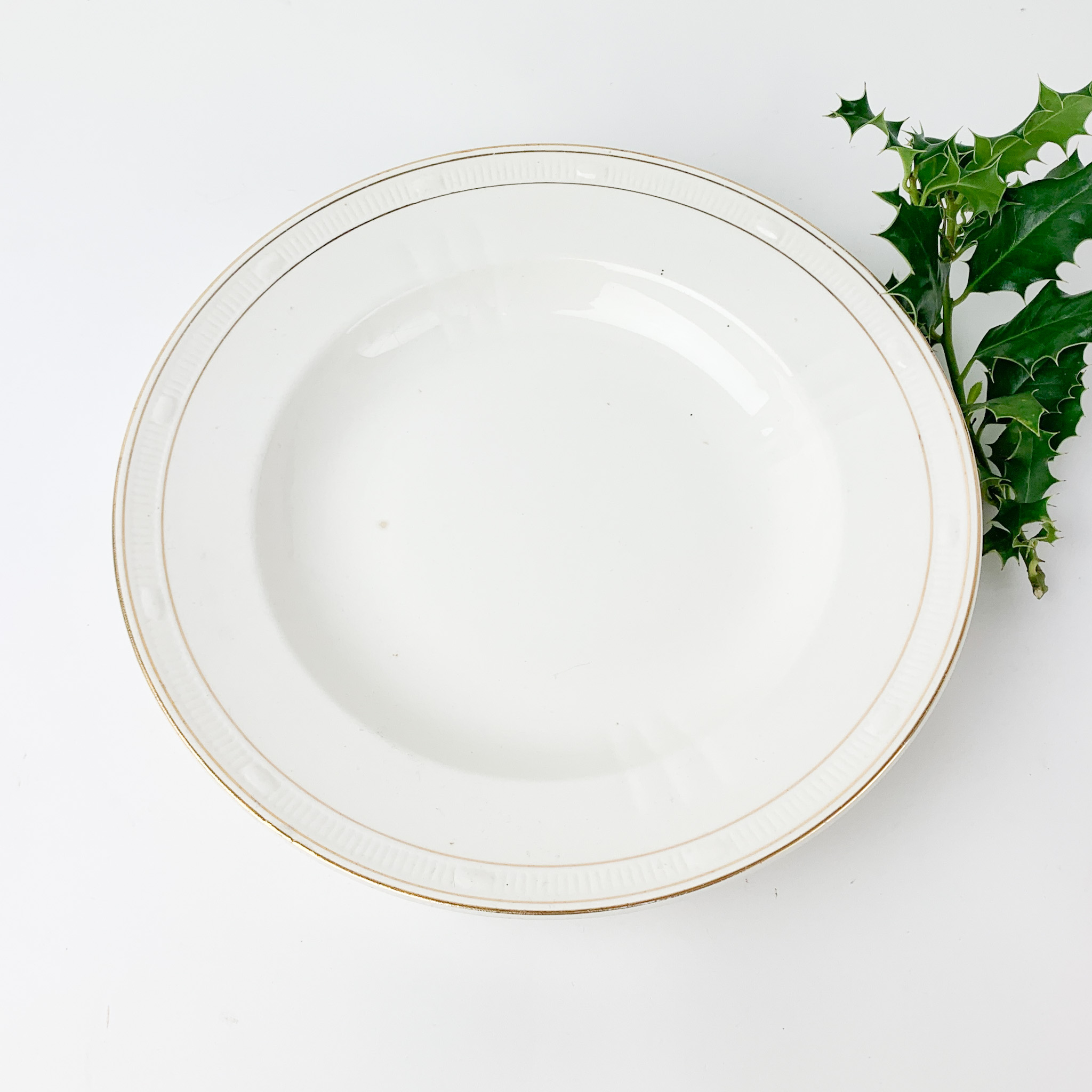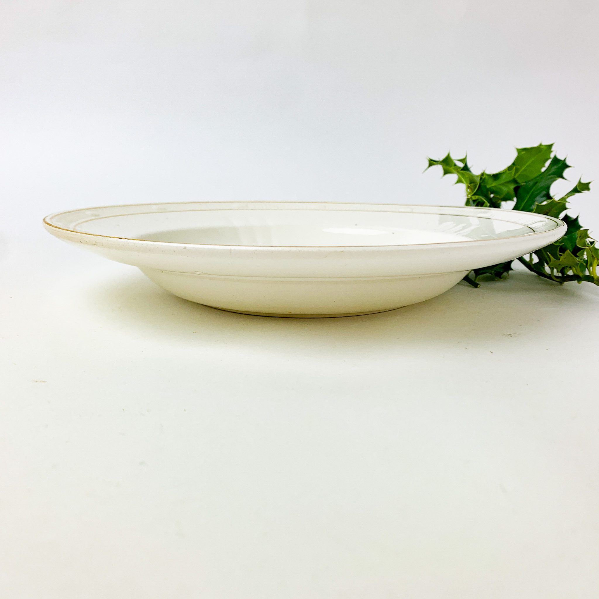 Flot Art Deco dyb tallerken, i råhvid fajance med tynde guldkanter, fra Villeroy & Boch i 1920'erne