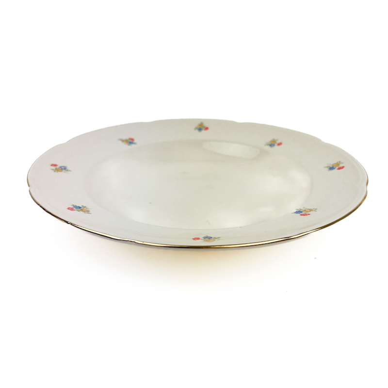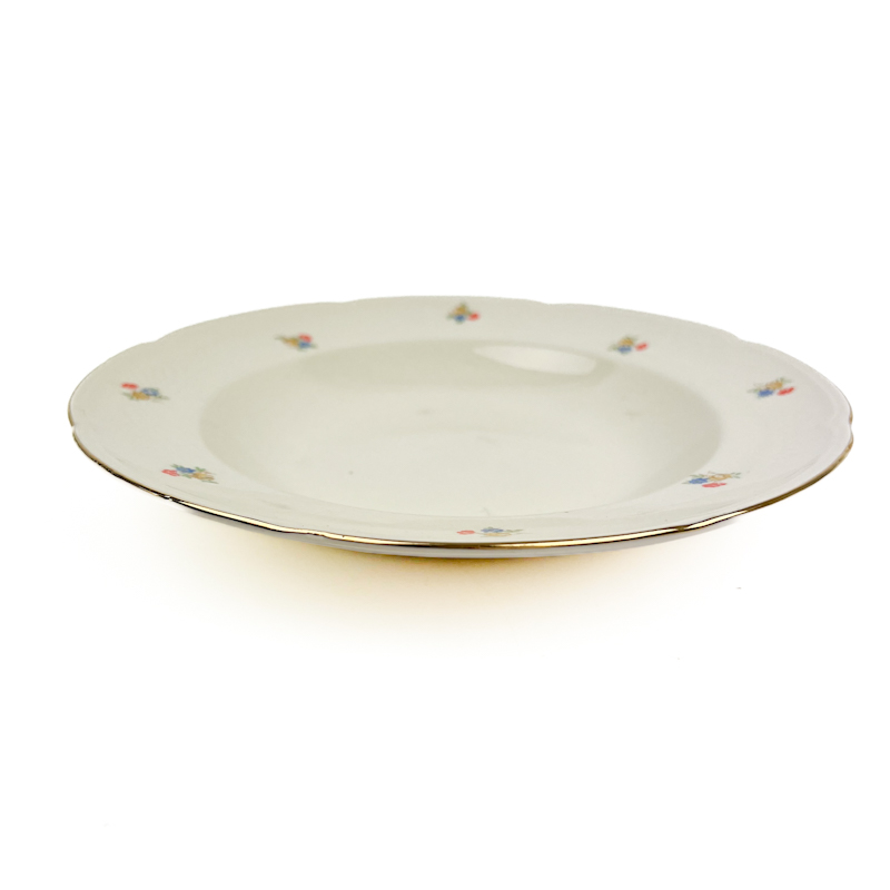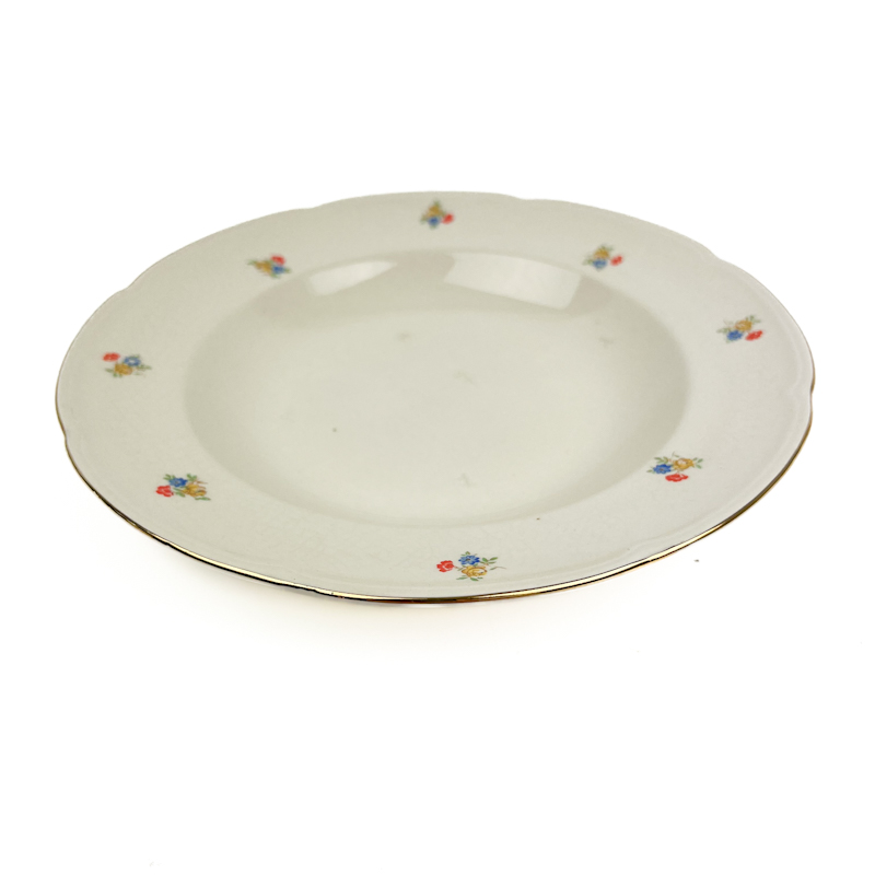 Tallerkenen har små håndmalede blomsterdekorationer og en let bølget kant med fin guldkant.