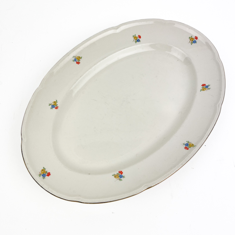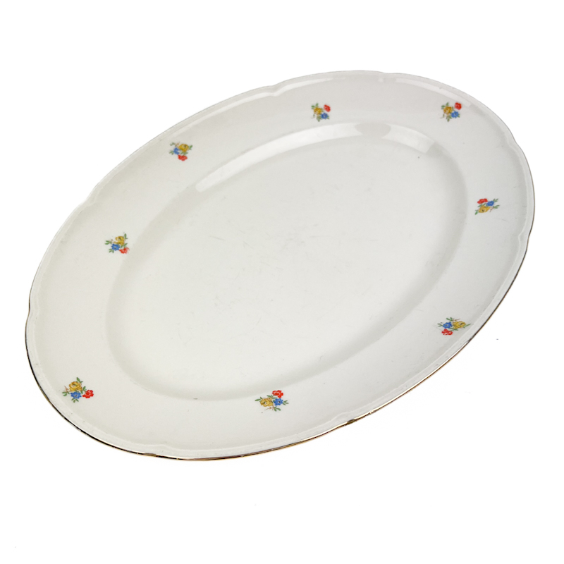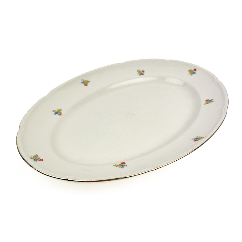 Fadet har små håndmalede blomster og let bølget kant med fin guldkant.