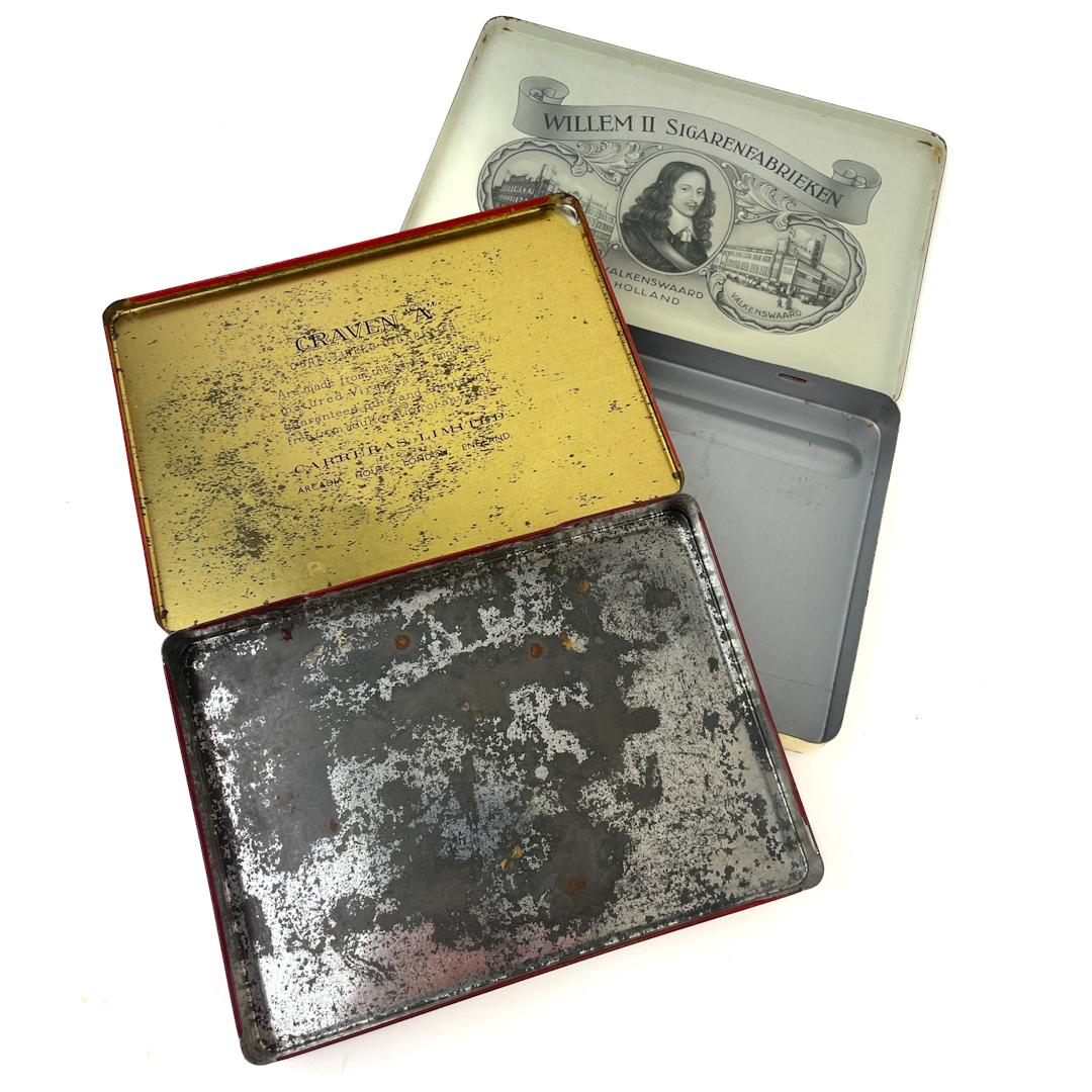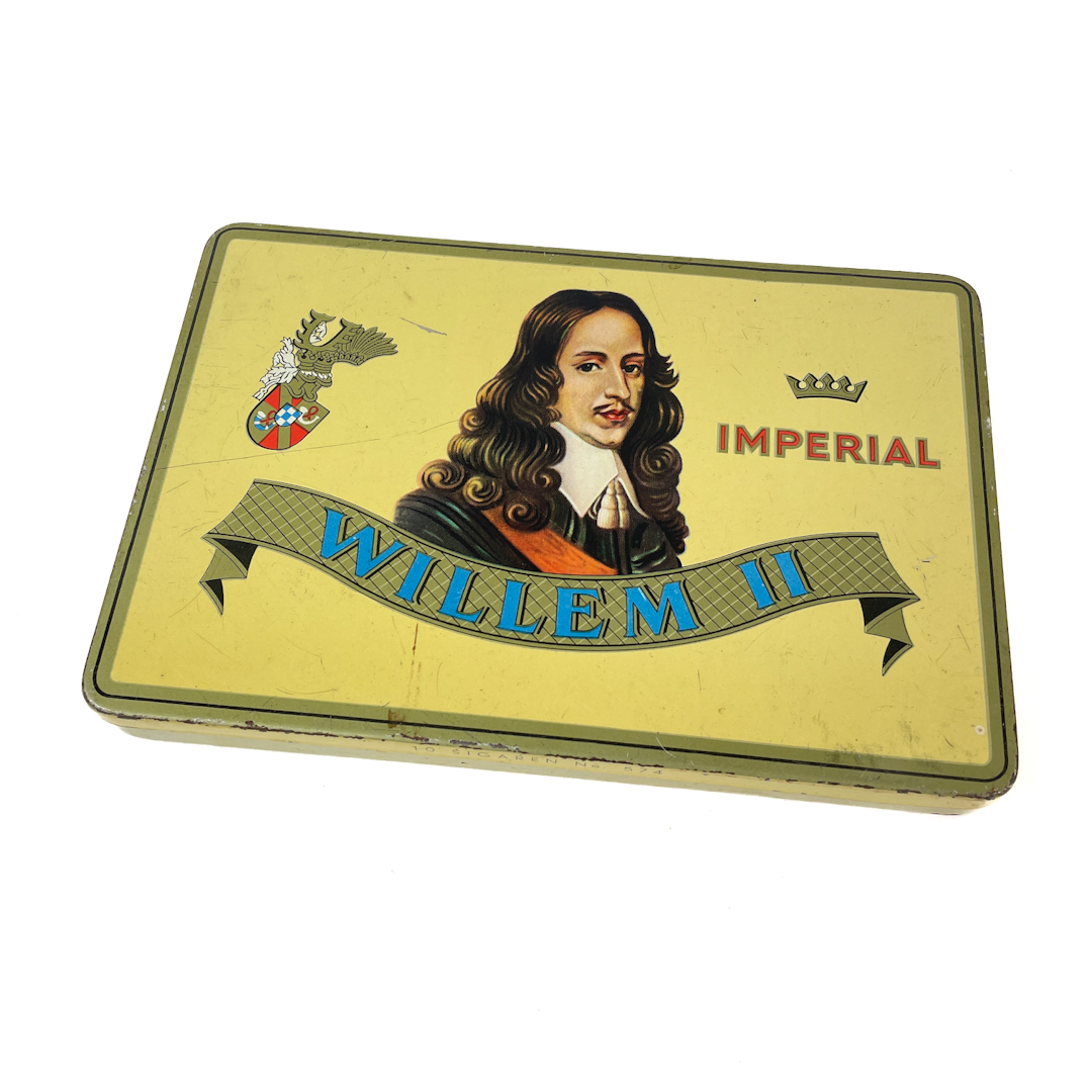 Original cigarkasse i blik fra Willem II Sigarenfabrieken, Holland.