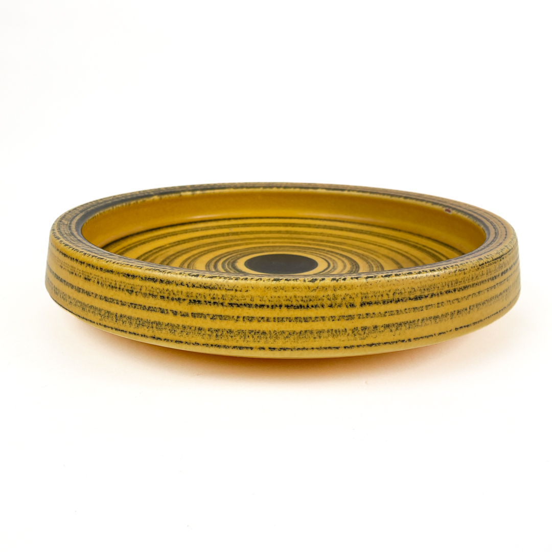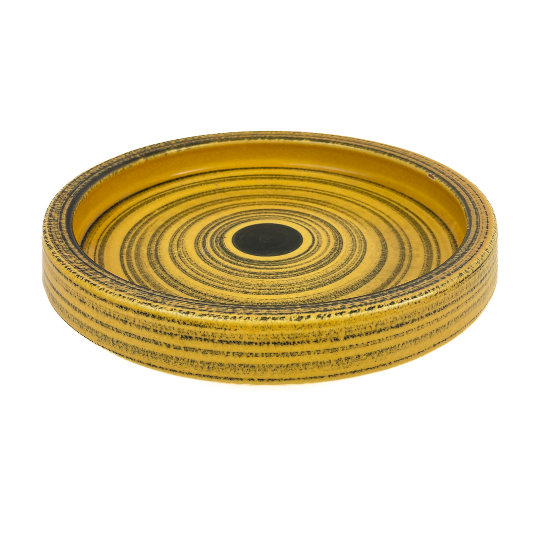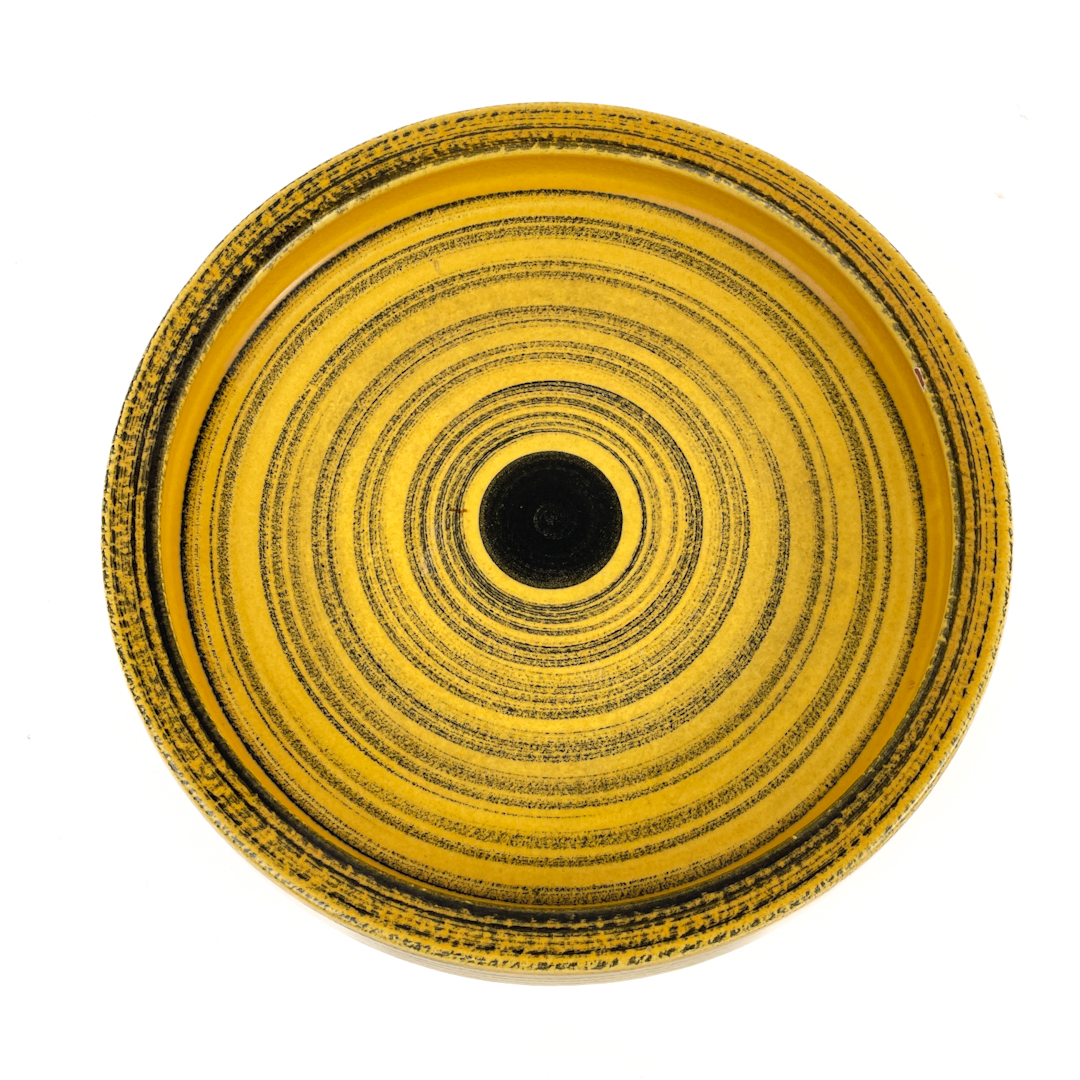 Smukt gult og sort mønster med koncentriske cirkler, der giver fadet et levende og grafisk udtryk.