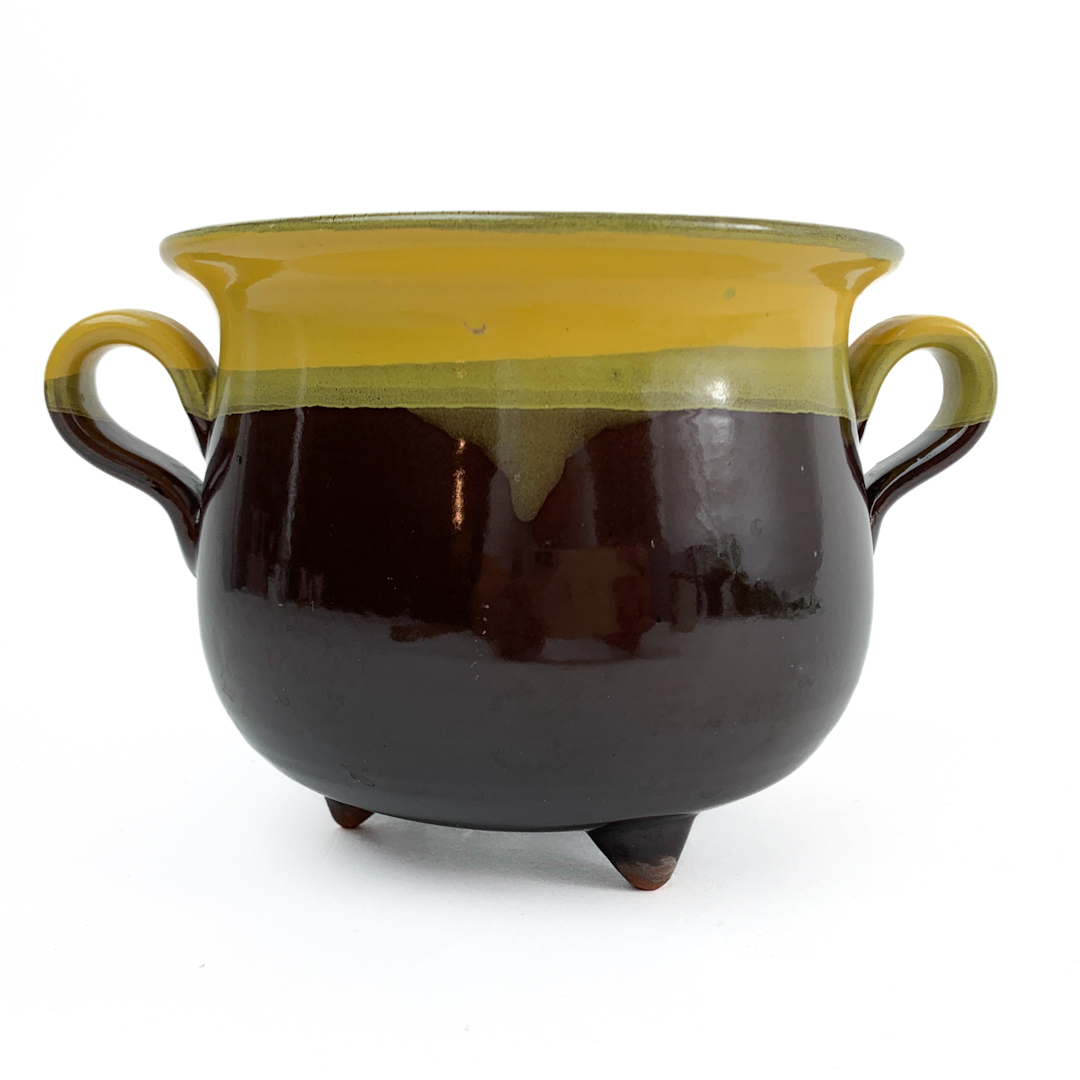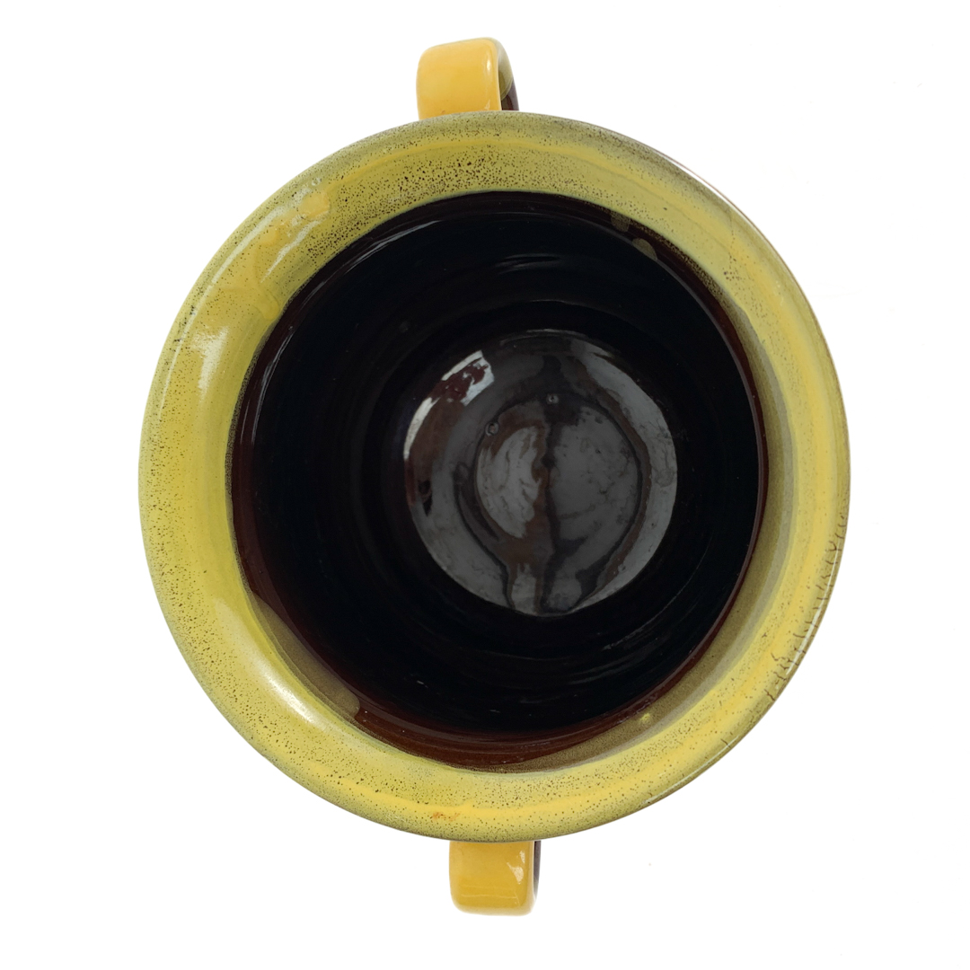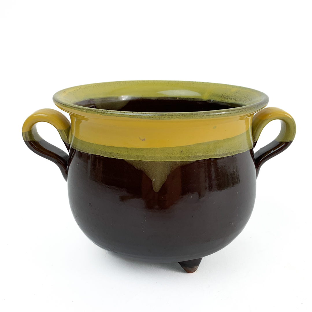 Skjuleren er glaseret i mørk chokoladebrun med bred gulgrøn kant og små fødder, der løfter formen elegant.