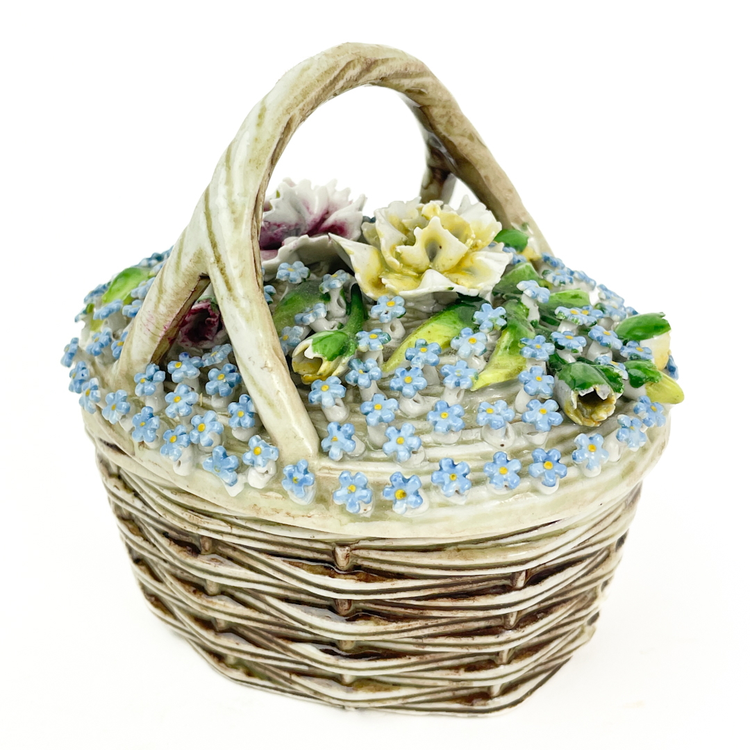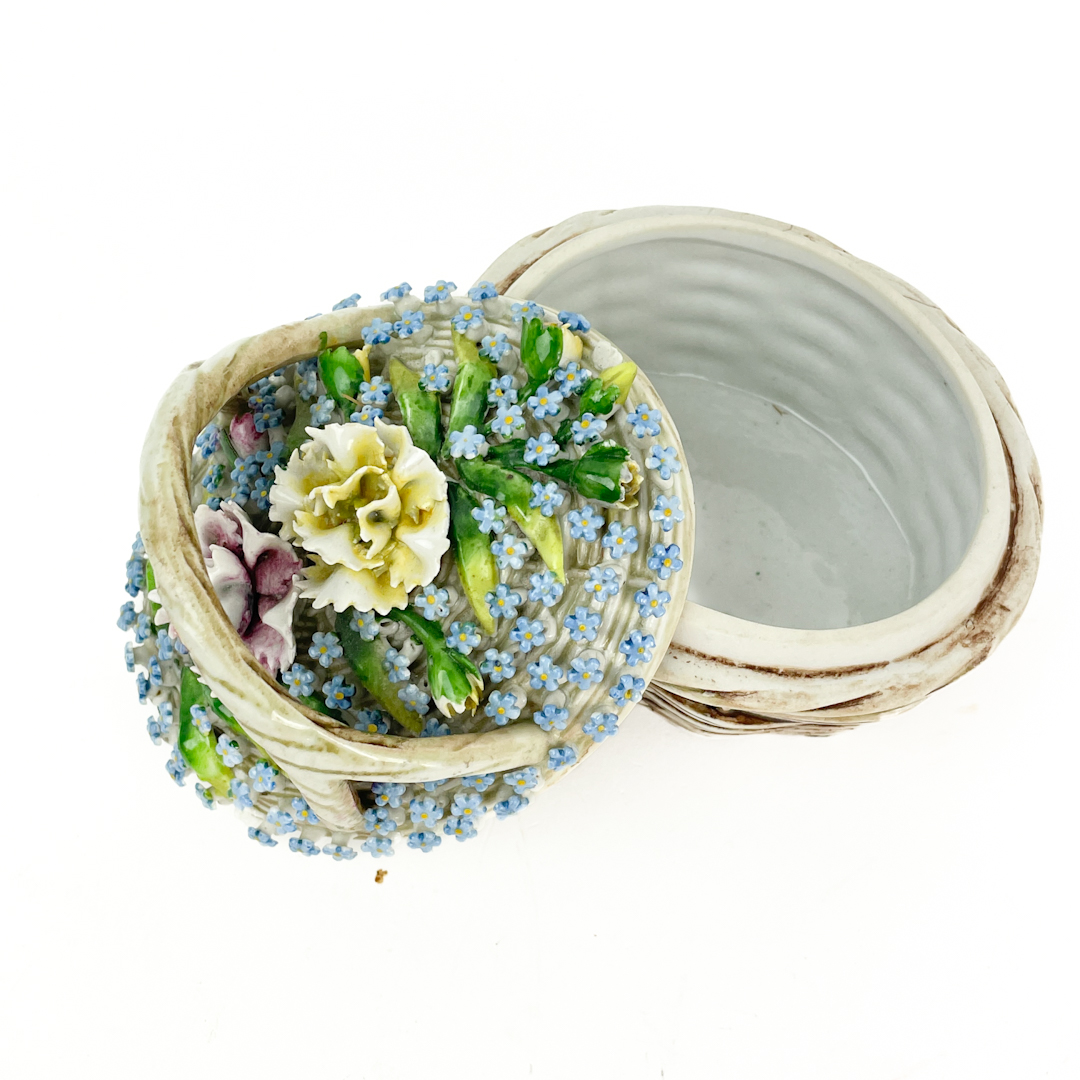 Smuk vintage porcelænskrukke med låg og håndtag formet som en fletkurv.