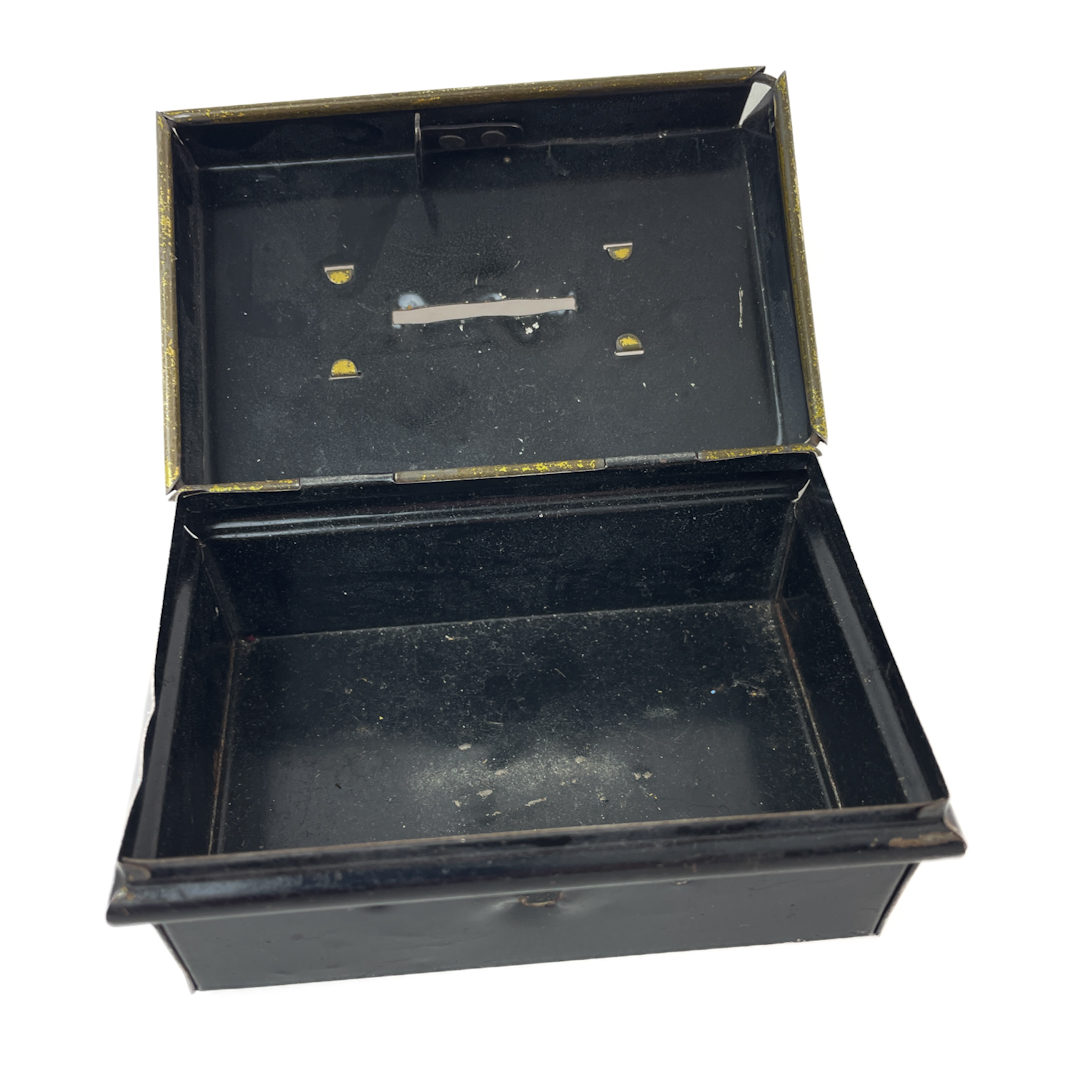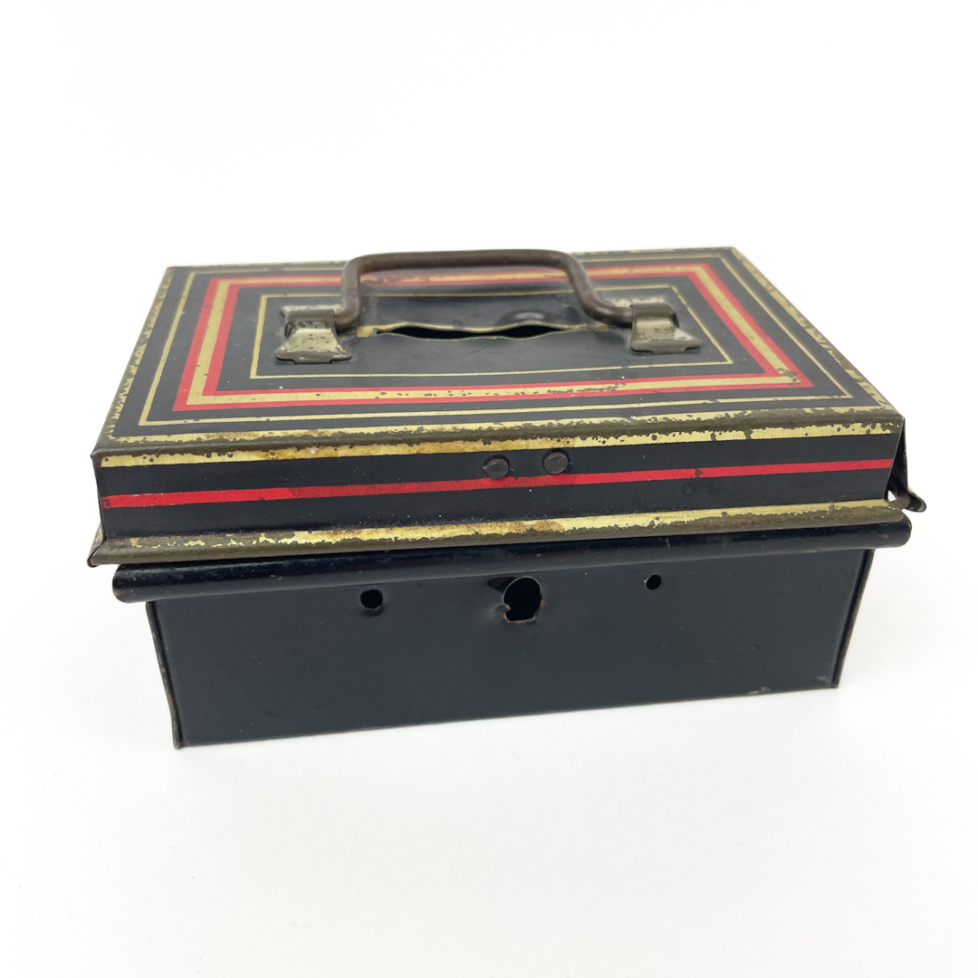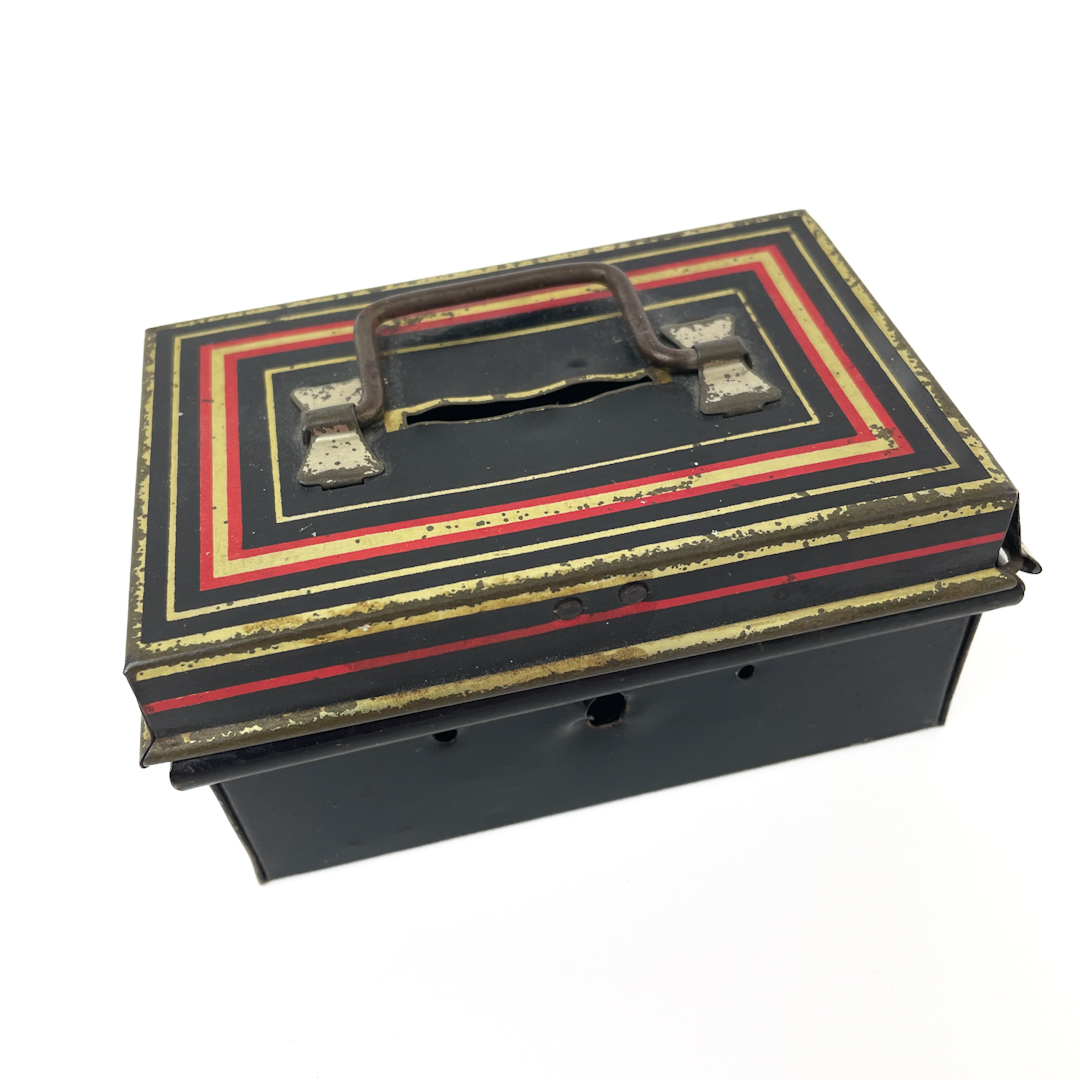 Sjælden vintage sparebøsse i blik med sort bundfarve og dekorative striber i rødt, hvidt og guld på låget.