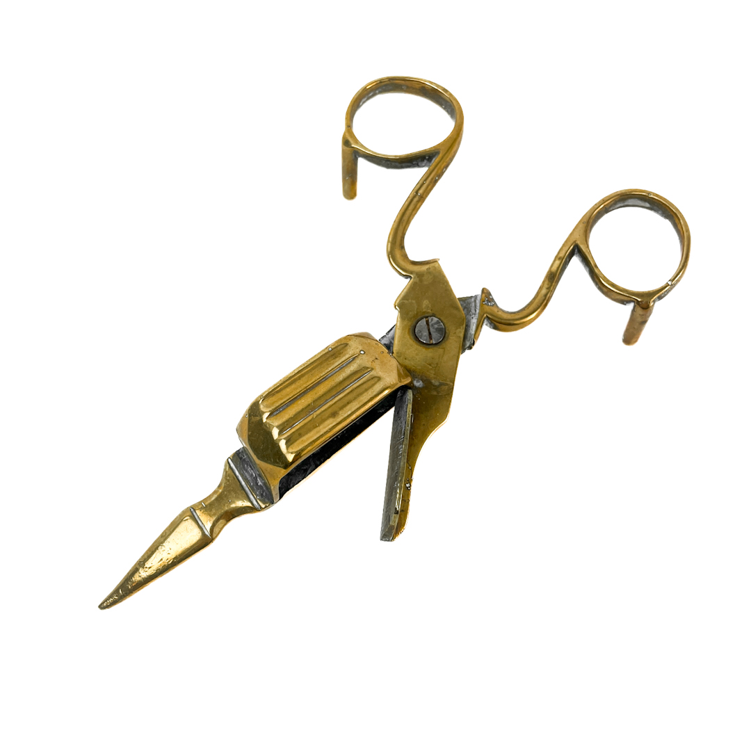 Brugt til at klippe væger på levende lys, så de brændte jævnt – et elegant og funktionelt stykke dansk lyskultur.