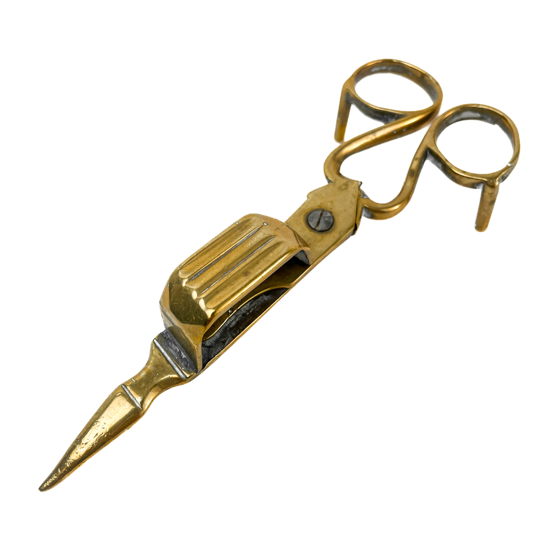 Flot antik lysesaks i messing med jernklinge og karakteristisk dobbelt ringgreb.