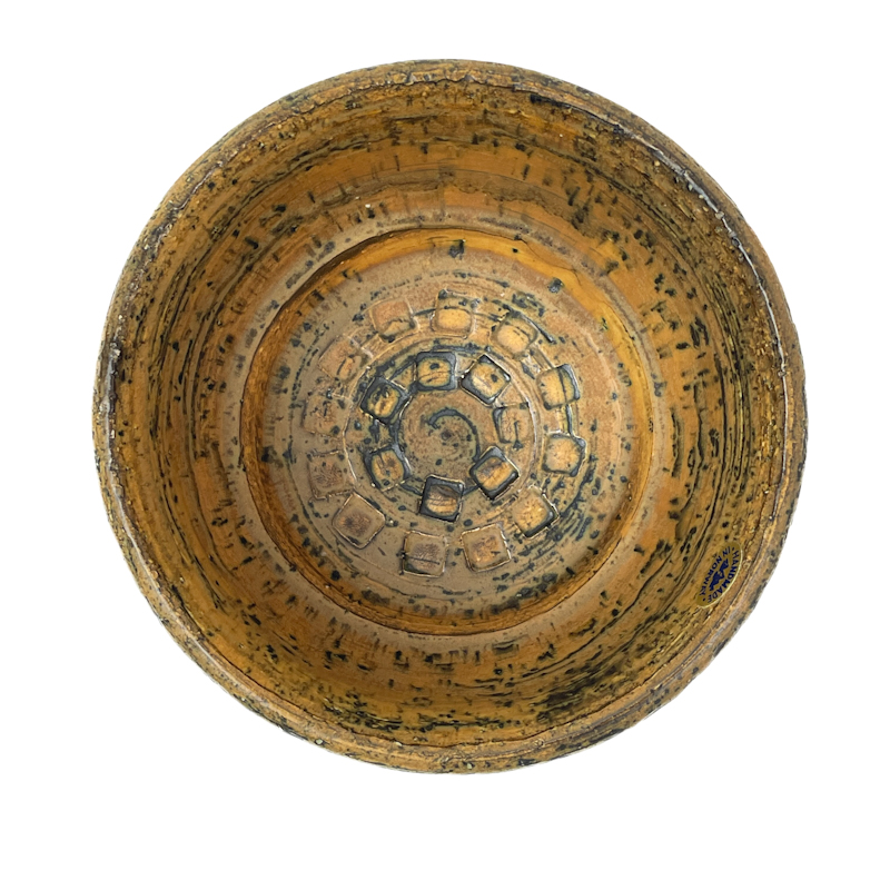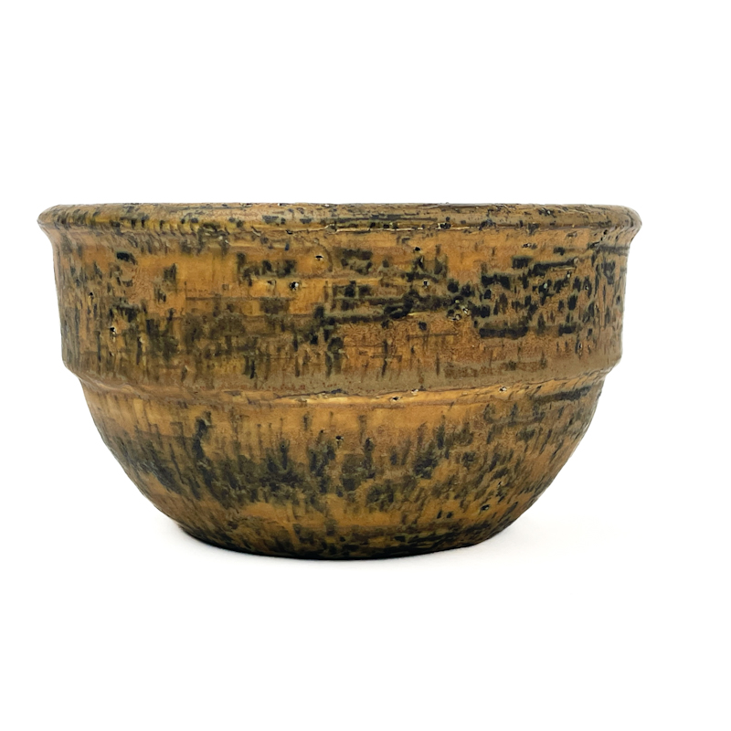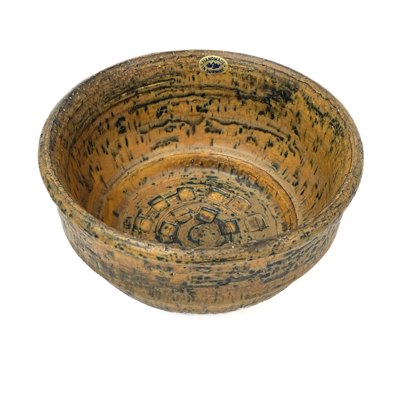 Smuk vintage skål i norsk stentøj med varm gyldenbrun glasur og mørke nuancer.