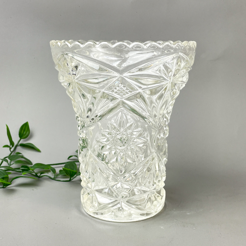 Smuk vintage vase i klart støbt glas med markant stjernemønster og elegant bølget kant. Vasen måler ca. 15,5 cm i højden.
