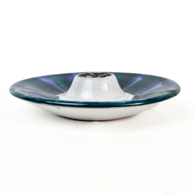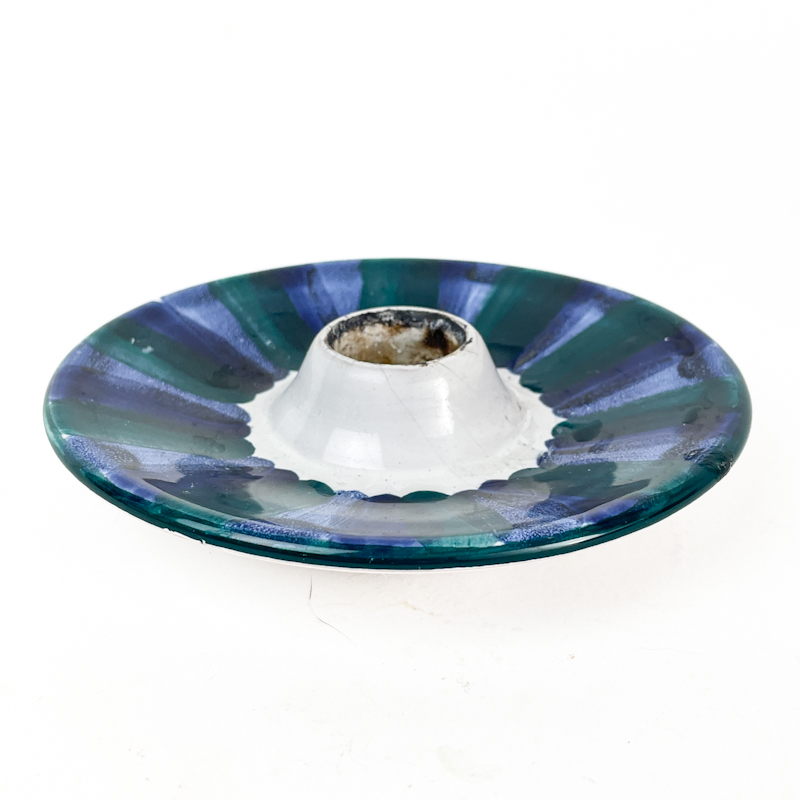 Blågrøn vintage lysestage i glaseret stentøj med håndmalede felter i et grafisk, cirkulært mønster.