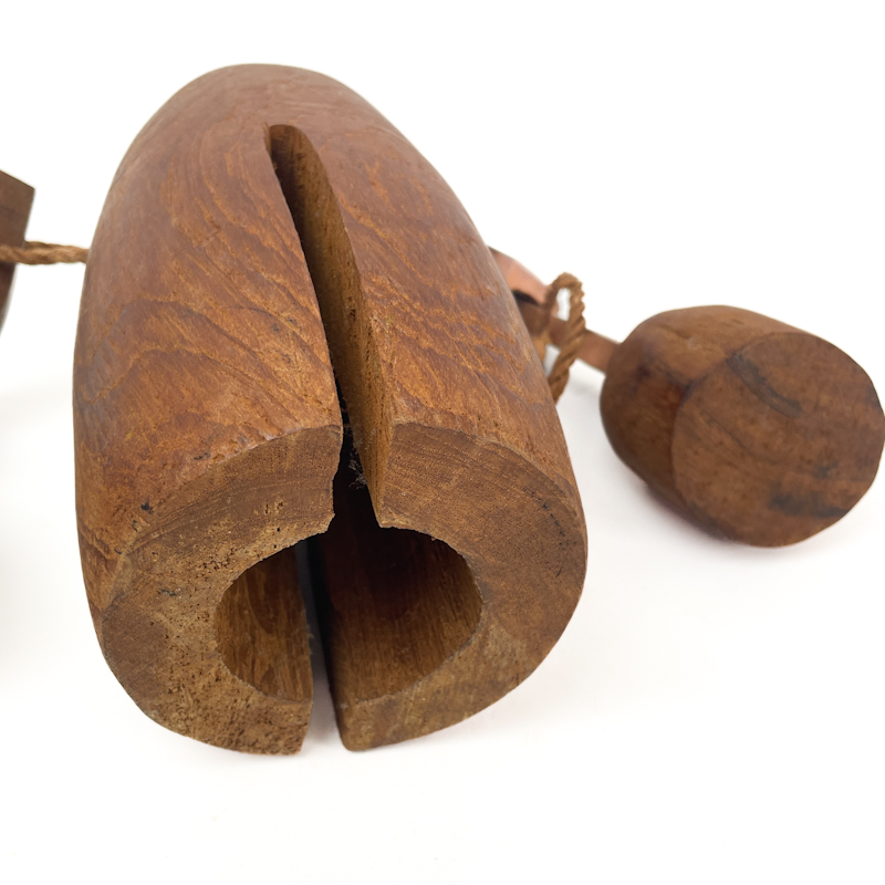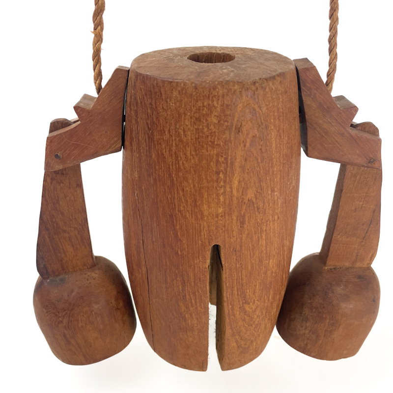 Dengen er håndskåret i massivt træ og består af den hule træklokke samt to bevægelige trækøller, samlet med reb.