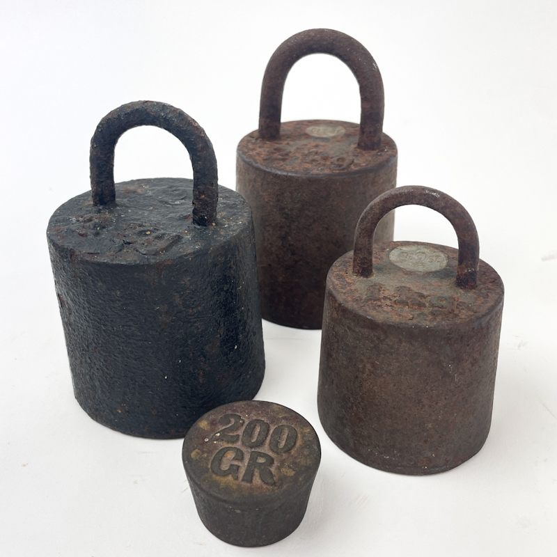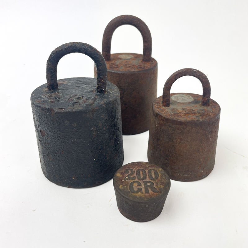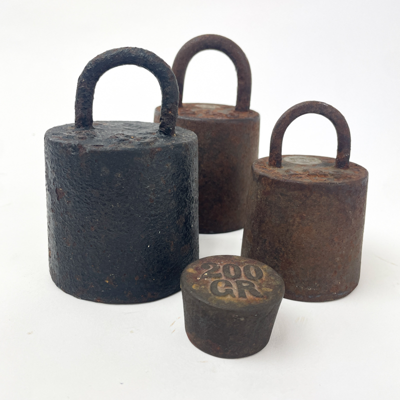 Sæt af fire gamle vægtlodder i massivt jern med flot, ensartet patina.