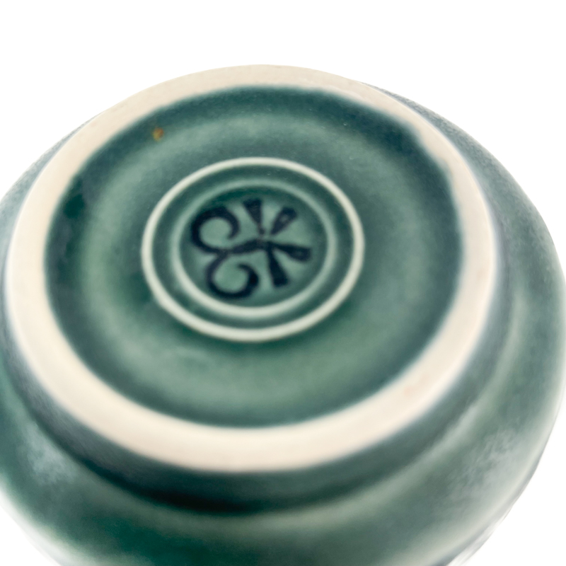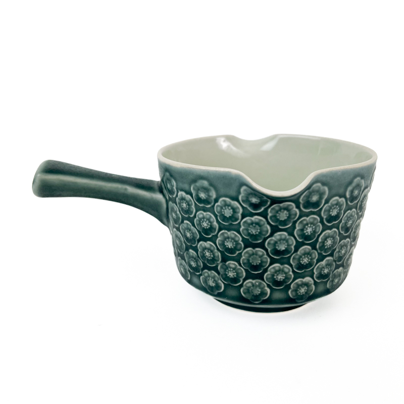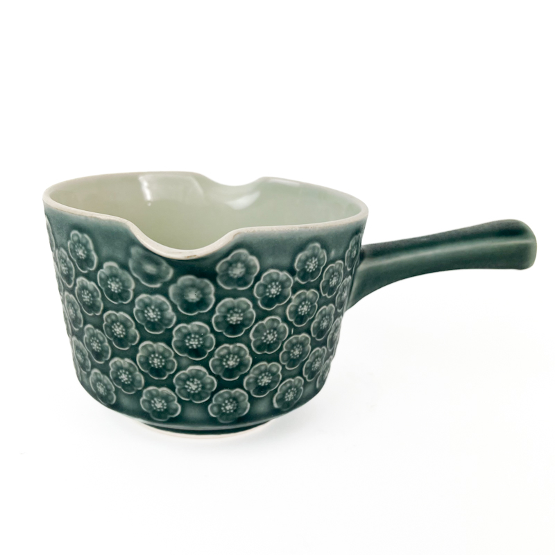 Saucekanden er fremstillet i stentøj med den karakteristiske blågrønne glasur og det fine blomsterrelief, som kendetegner Azur-stellet.