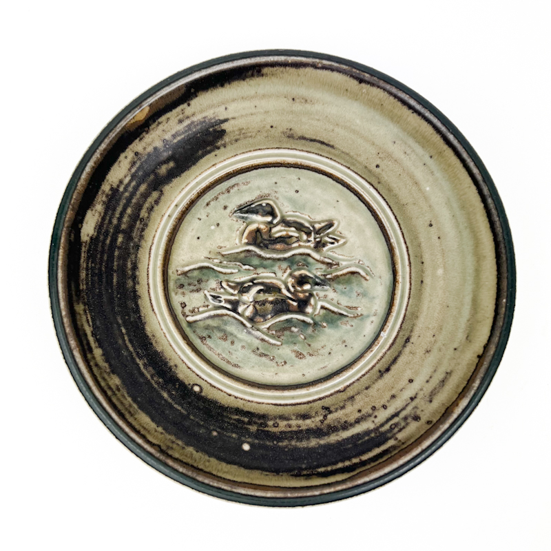 Fadet er udført i stentøj med karakteristisk glasur i grønne og mørke nuancer samt relief med svømmende ænder i midten.