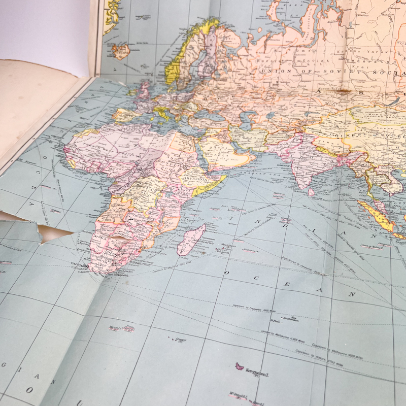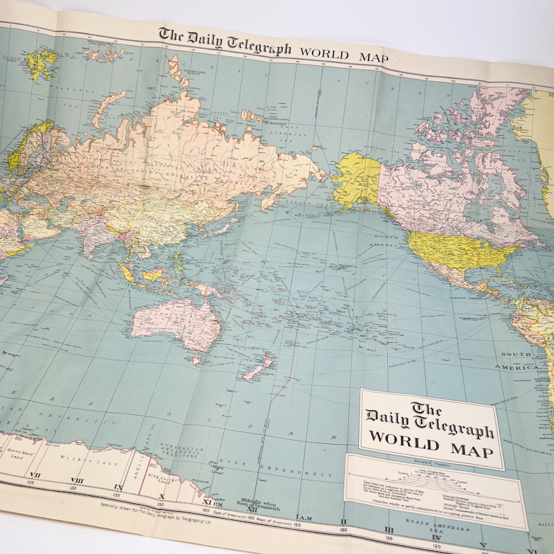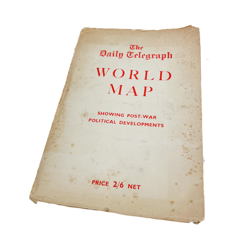Originalt vintage verdenskort fra efterkrigstiden udgivet af The Daily Telegraph med fokus på politiske forhold efter 2. verdenskrig.