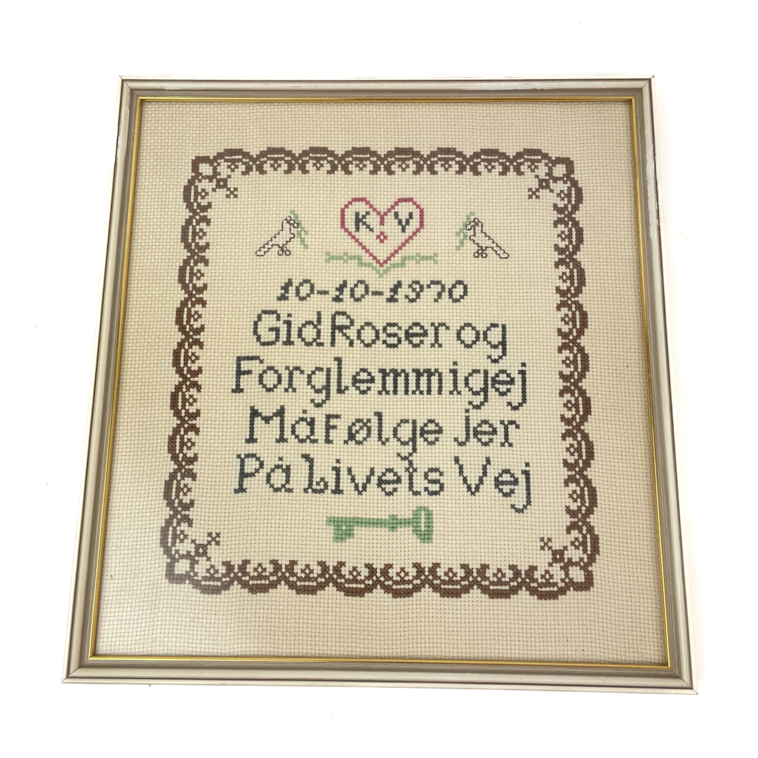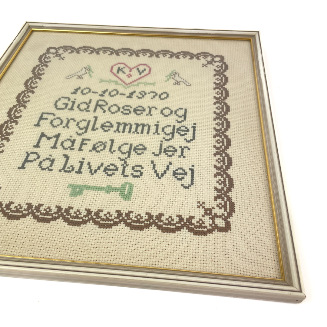 Smukt broderi fra 1970 med tekst: