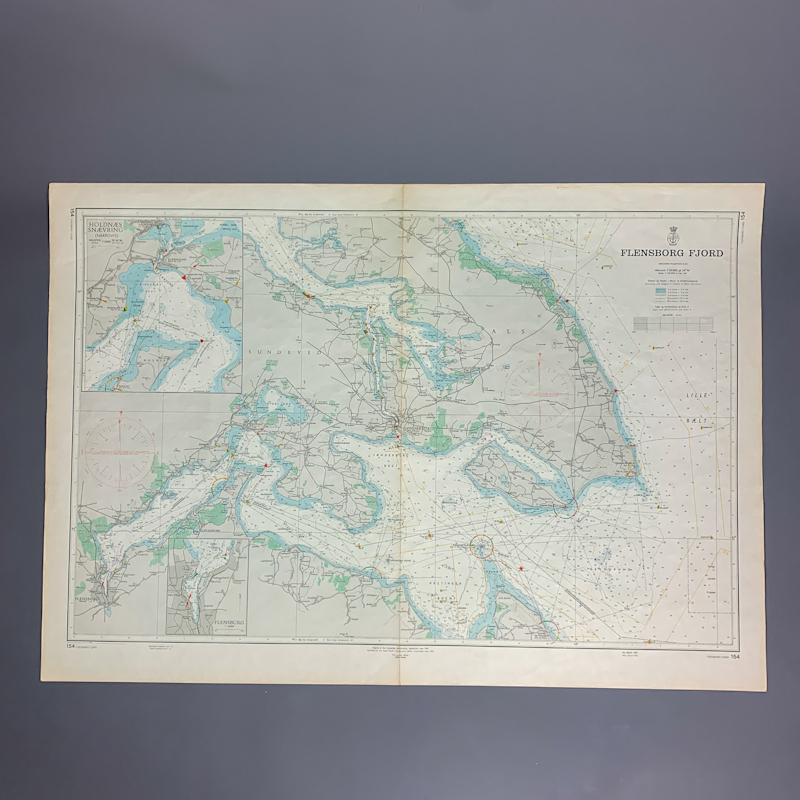 Originalt gammelt søkort over Flensborg Fjord med detaljeret og klassisk kortgrafik i afdæmpede blå og beige nuancer.