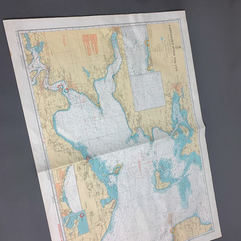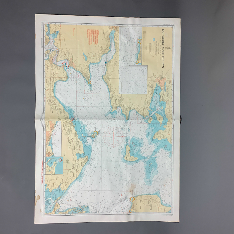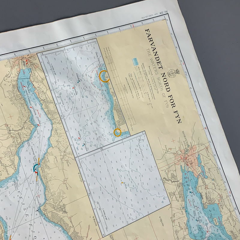 Originalt gammelt søkort over farvandet nord for Fyn med klassisk og detaljeret kortgrafik i blå, beige og lyse toner.