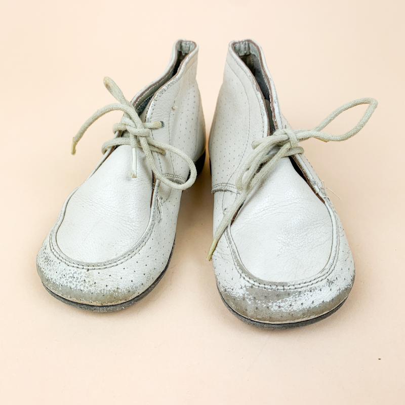 Fine vintage babysko i hvidt skind med klassisk snørelukning og små perforerede detaljer.