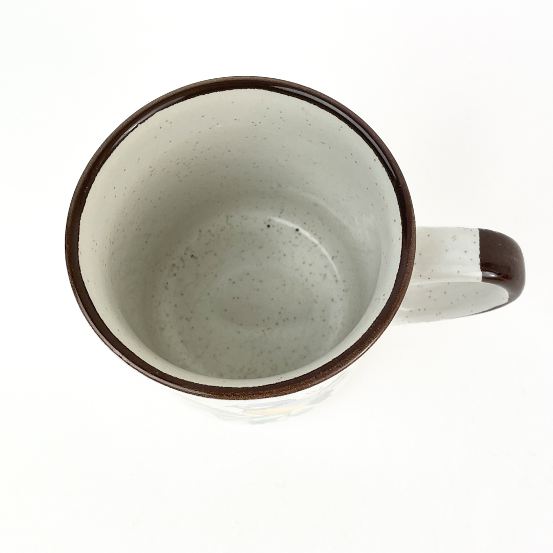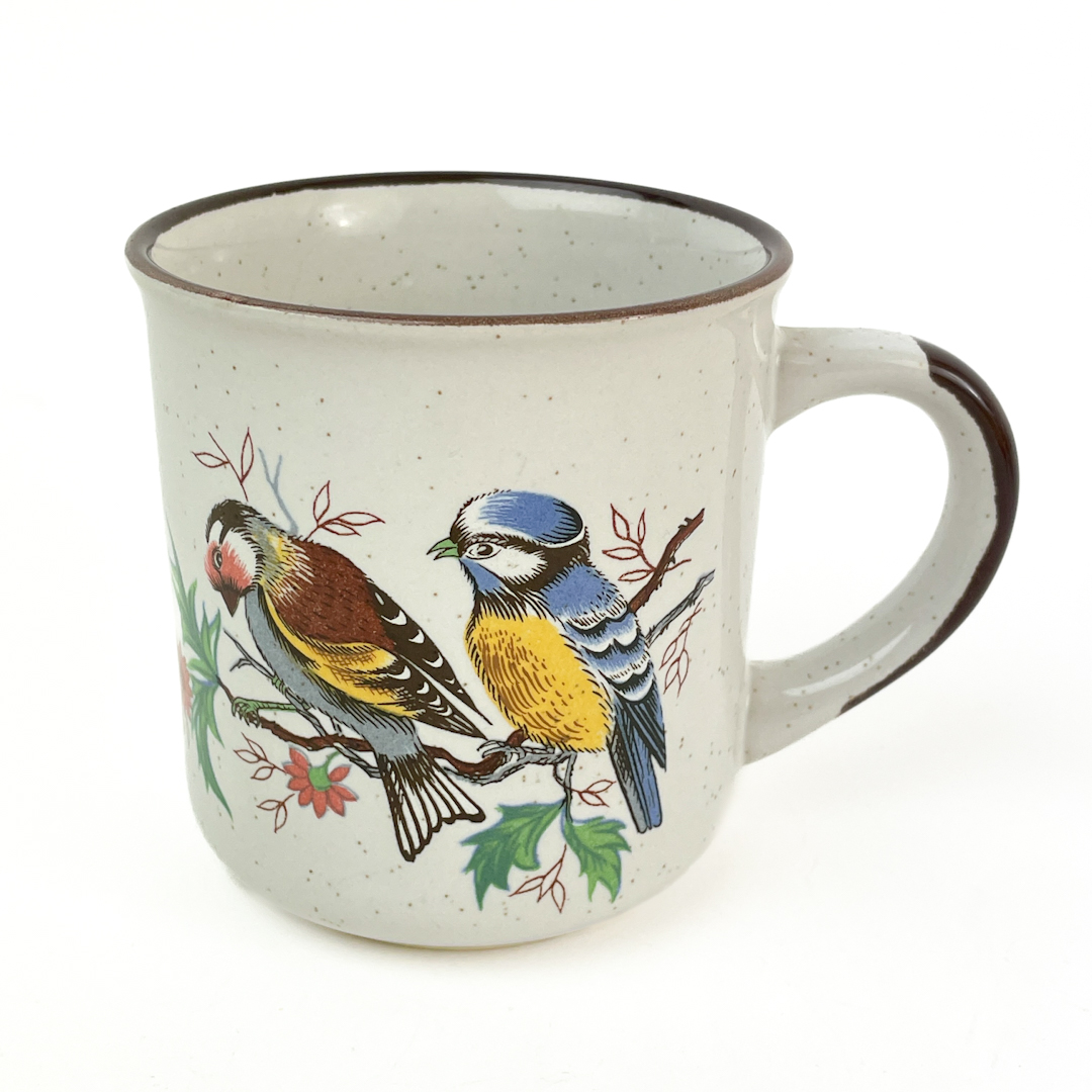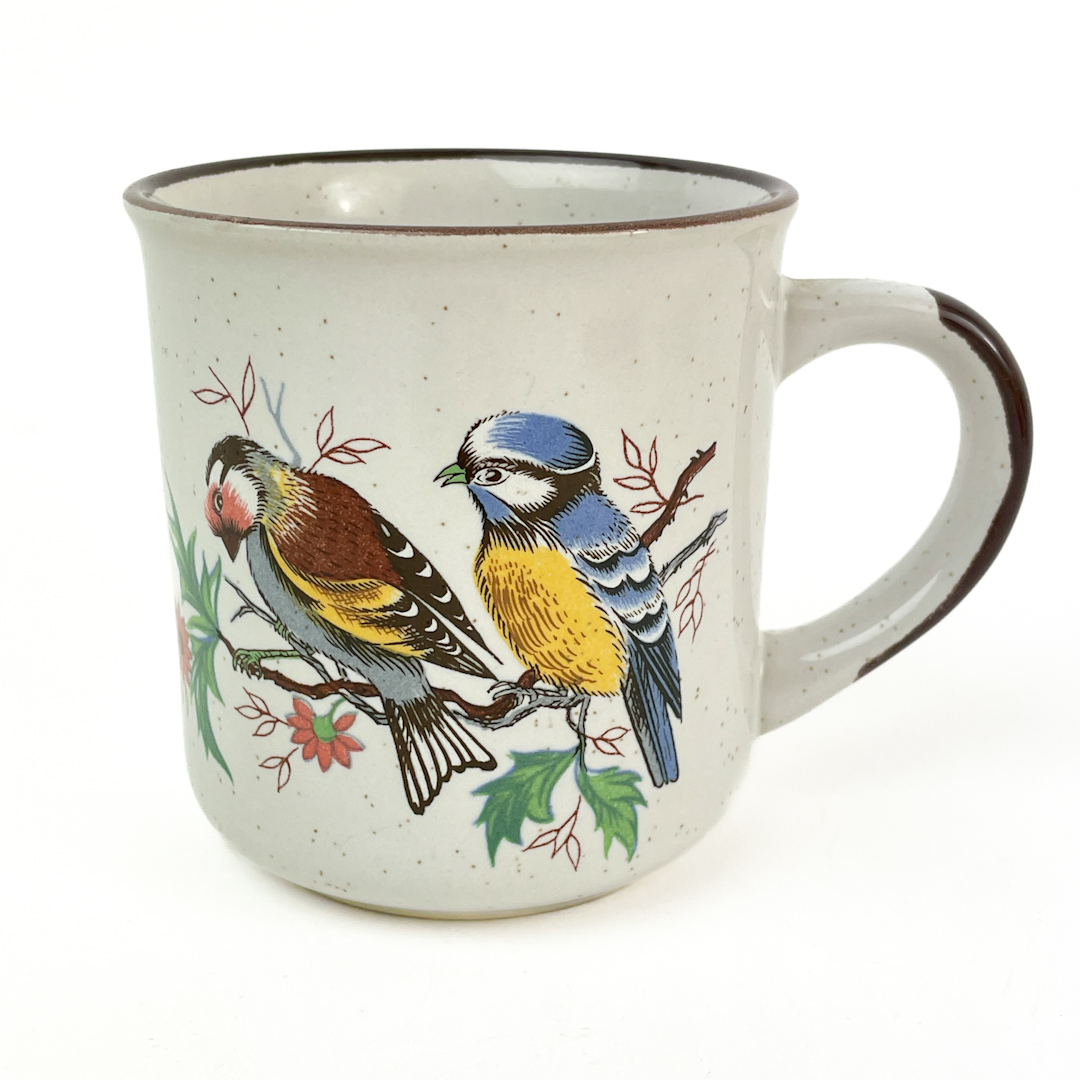 Smukt retro krus i stentøj med motiv af småfugle i klare farver på grene.