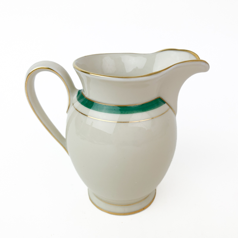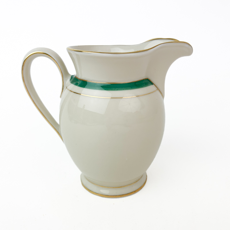Elegant vintage flødekande fra Københavns Porcellains Maleri, dekoreret med grøn bort og håndmalede gulddetaljer.