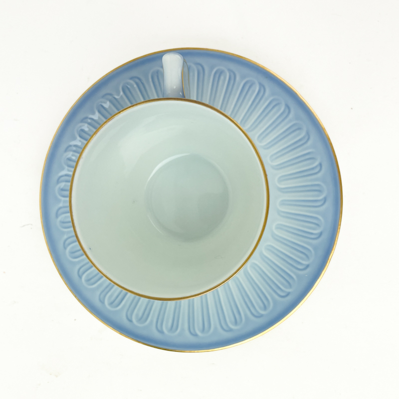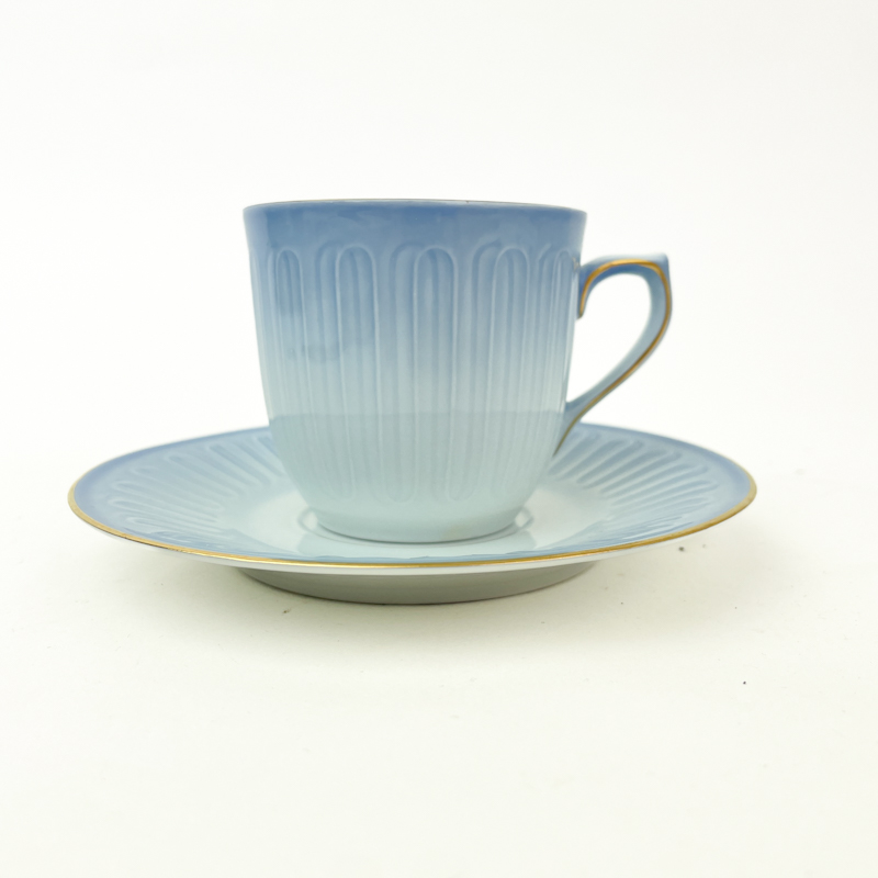 Elegant vintage kop og underkop fra Bing & Grøndahl’s Ballerina-stel i lyseblåt porcelæn med klassisk guldkant.