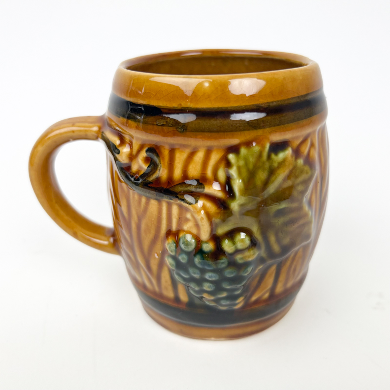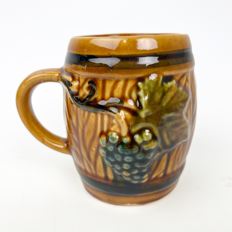 Dekorativt retro krus i glaseret fajance med relief af drueklase og blade i varme brune og grønne nuancer.