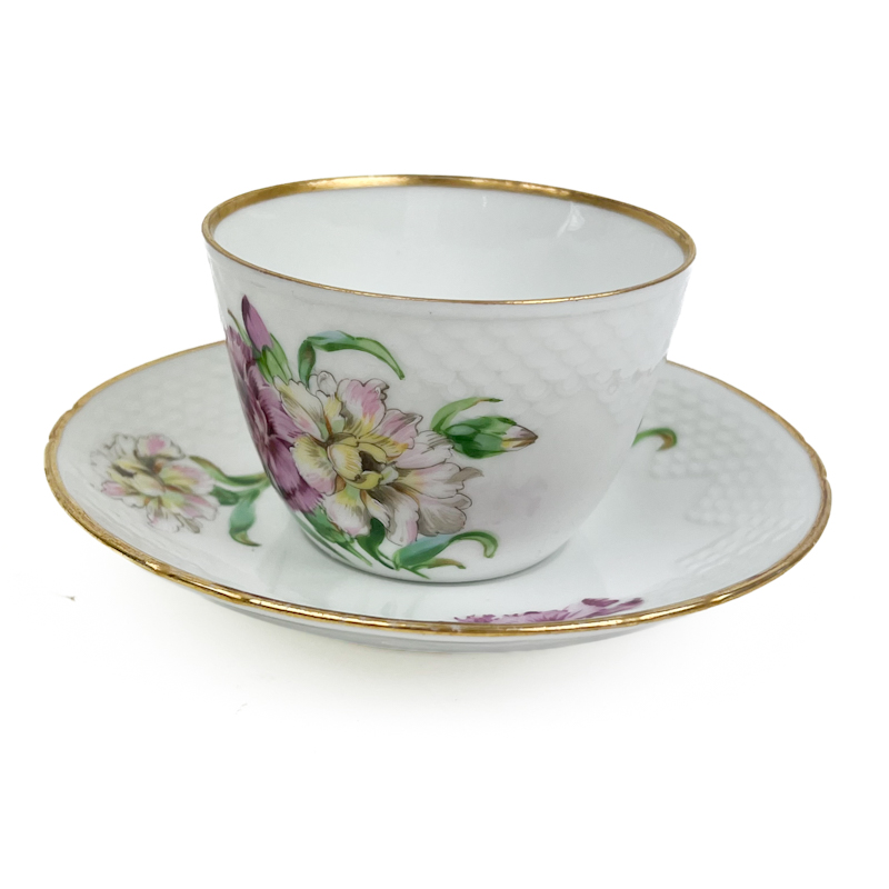 Koppen er udført i hvidt porcelæn med fin relief og håndmalede blomsterdetaljer.