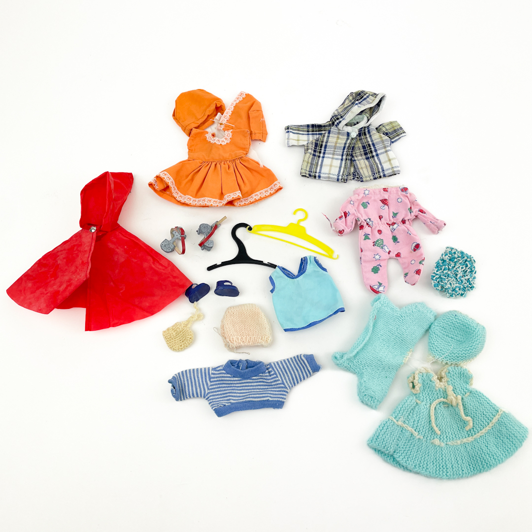 Sættet indeholder strikket kjole med hue og trøje, buksedragt, skjorte, kjoler, kåbe, samt små accessories som sko, huer og bøjler.