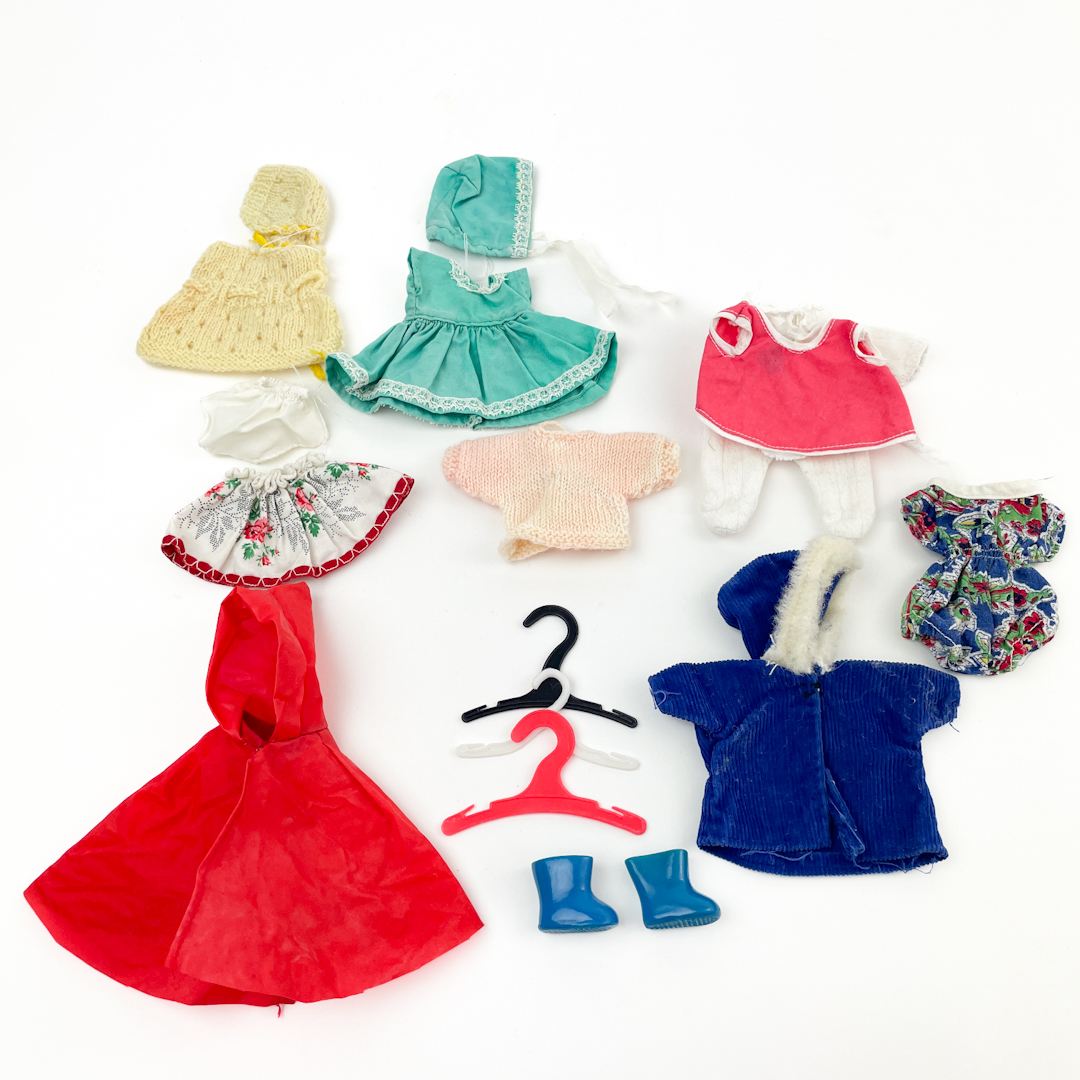 Indeholder strikket kjole med hue, bluse, nederdele, kjoler, kappe, frakke med hætte, regnslag, støvler og små bøjler.