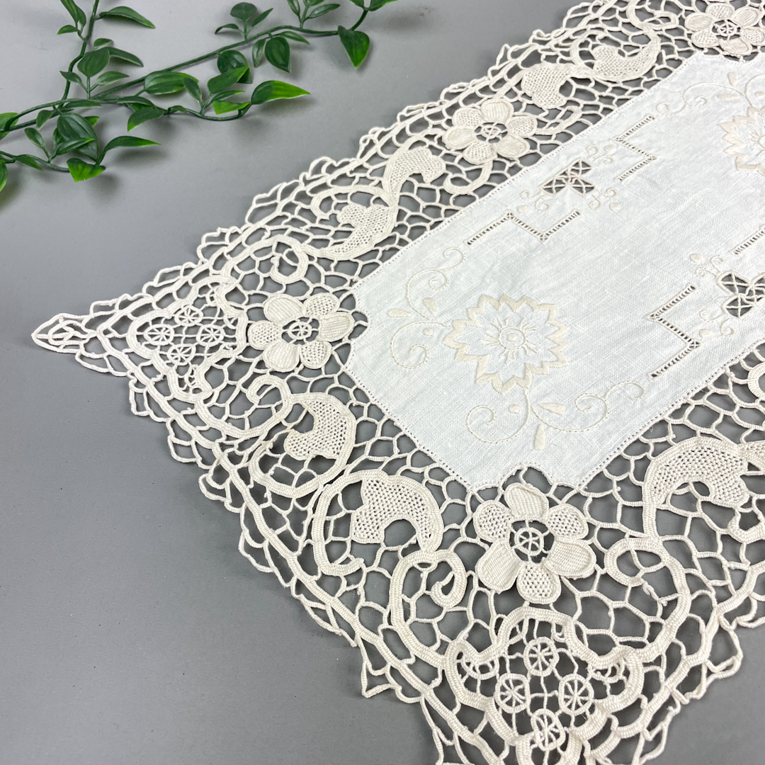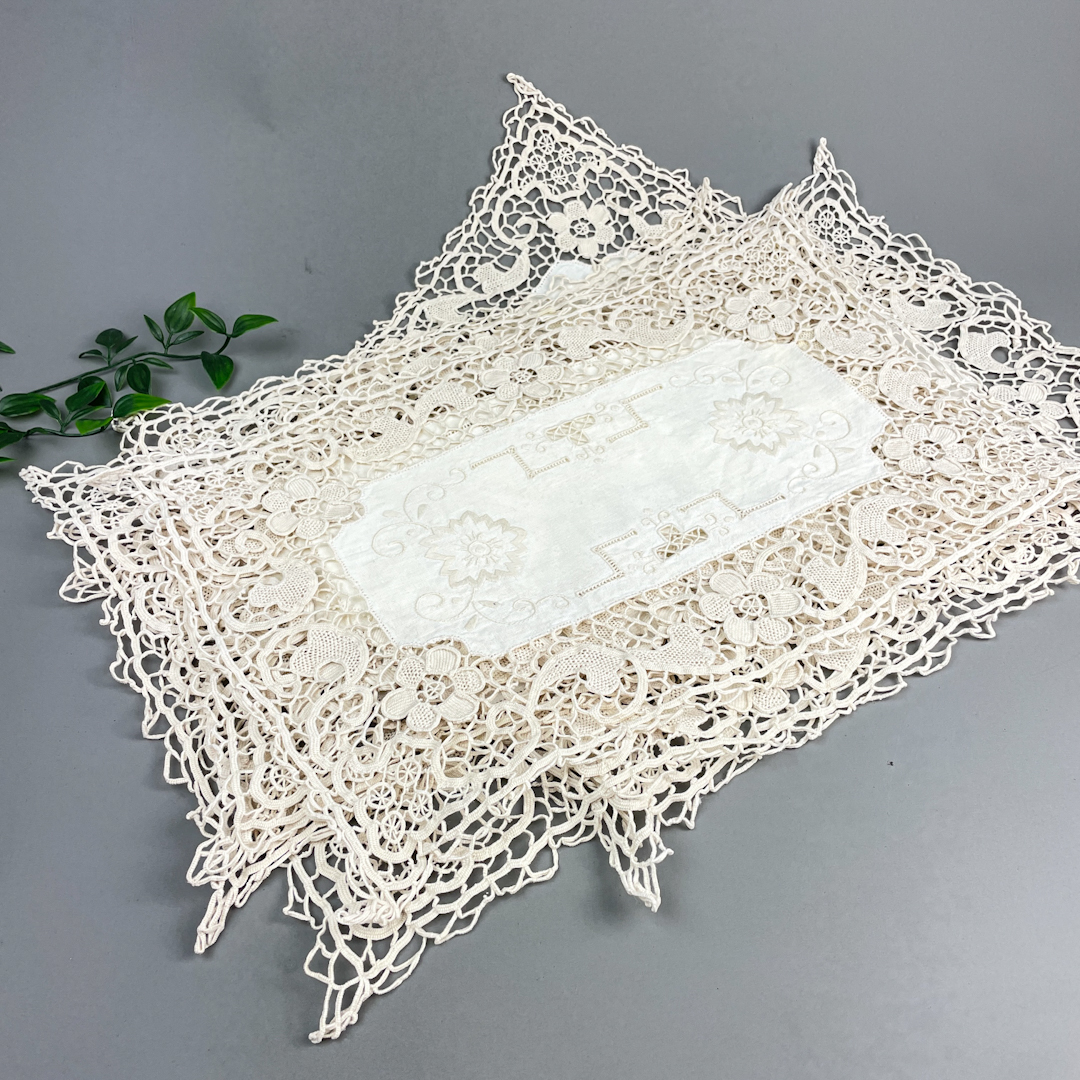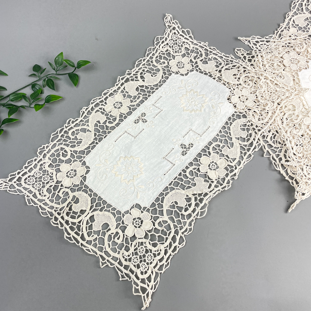 Sæt med seks rektangulære vintage dækkeservietter i hvidt linned med smuk blondekant med blomster og dekorative mønstre.