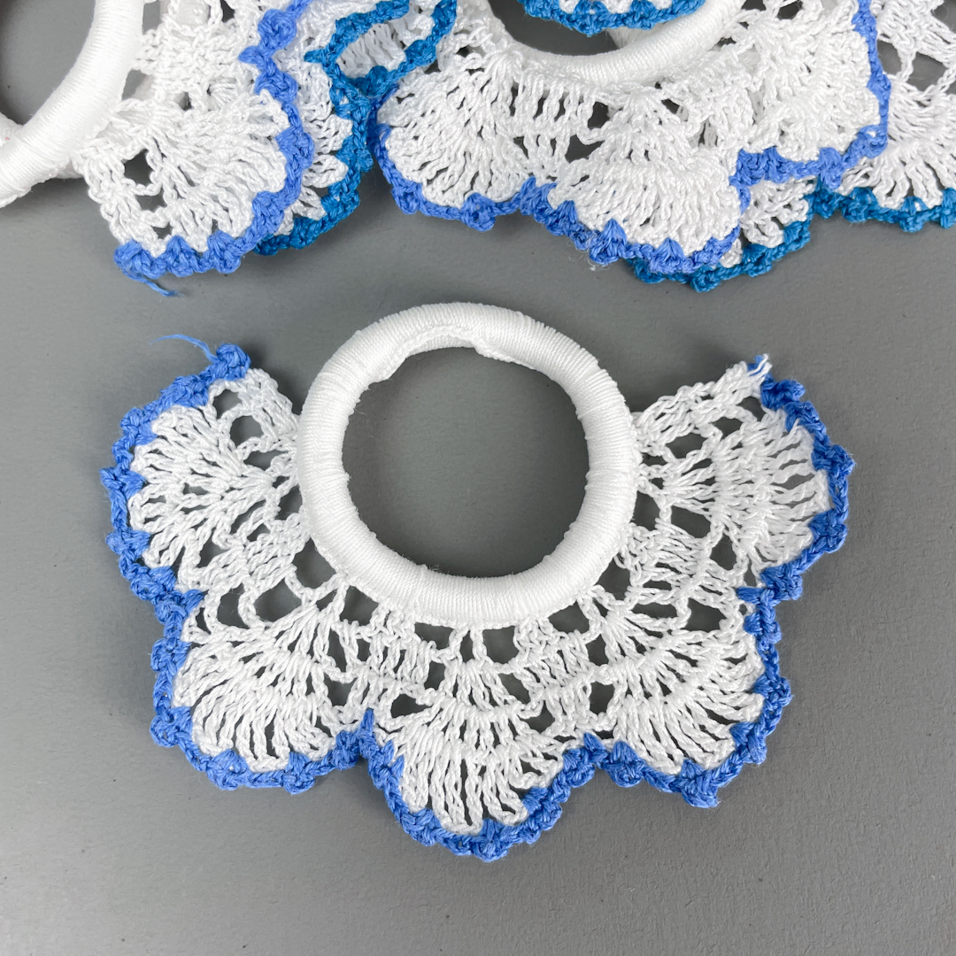 Hver ring er udført i hvid tråd omkring en fast inderring og måler ca. 10 cm i bredden.