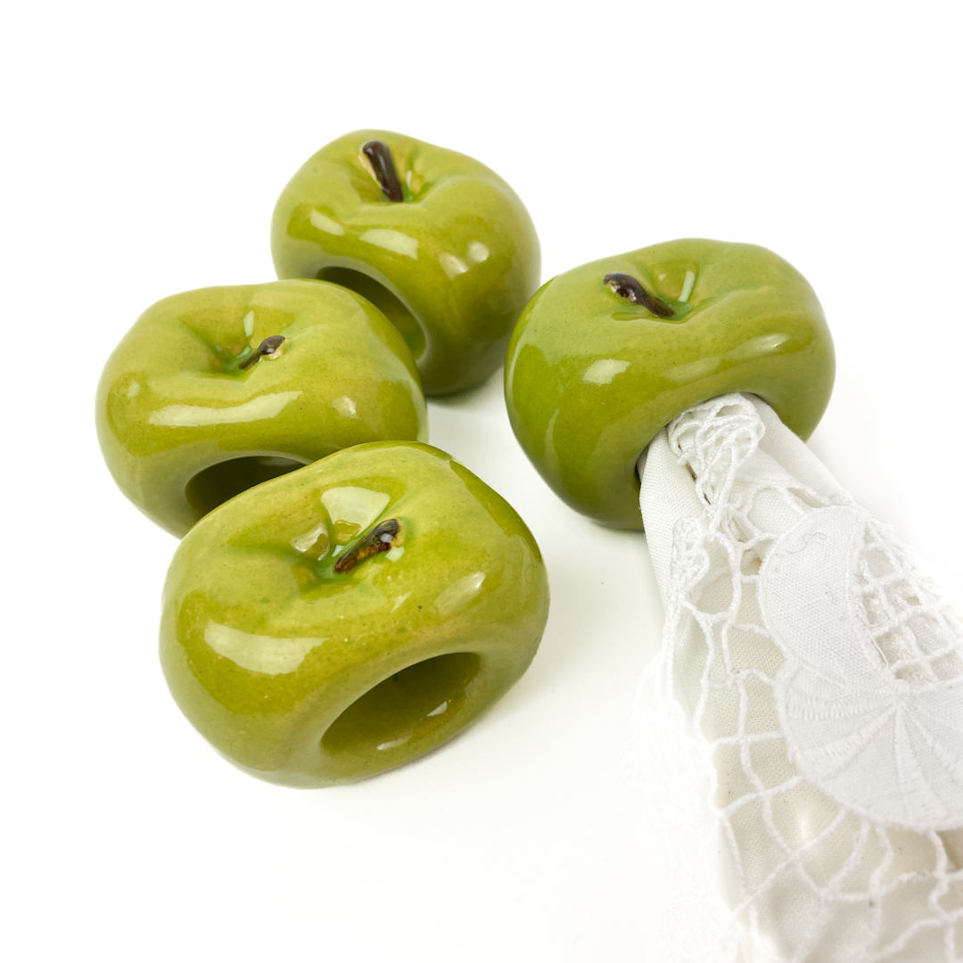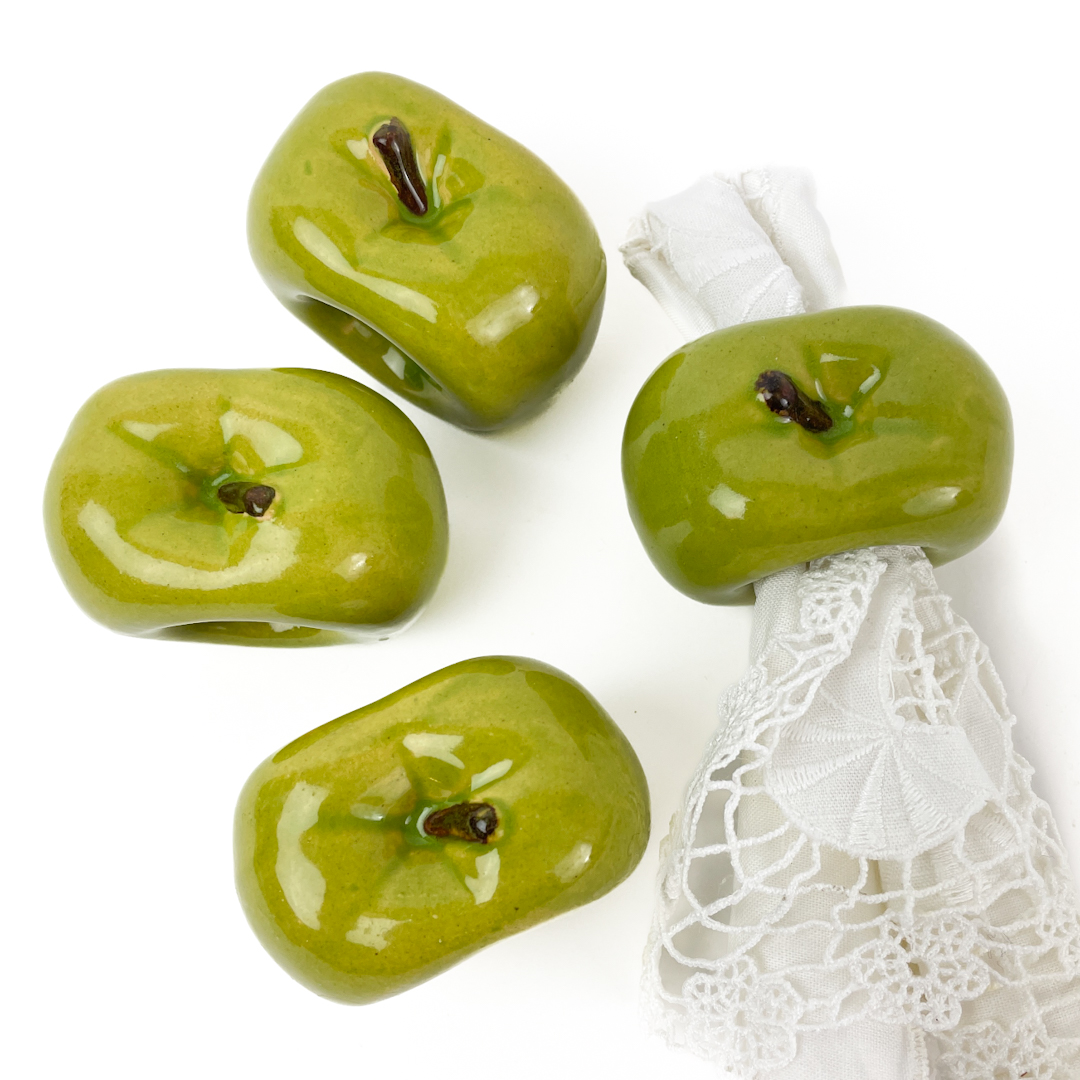 Dekorative retro servietringe i glaseret keramik formet som æbler.