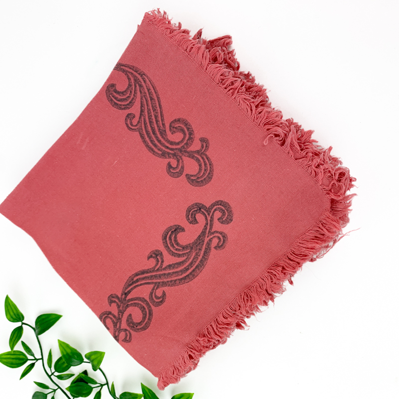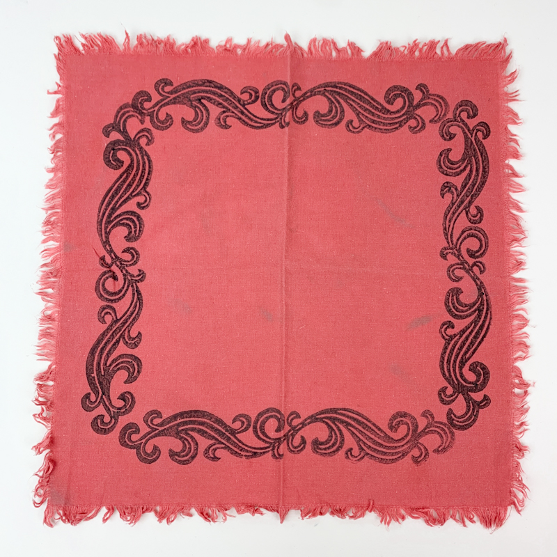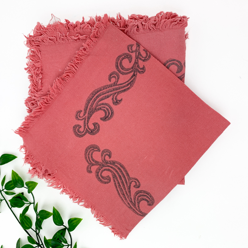 Sæt med ti retro mundservietter i støvet rød bomuld med dekorativt stoftryk i mørkere nuance.