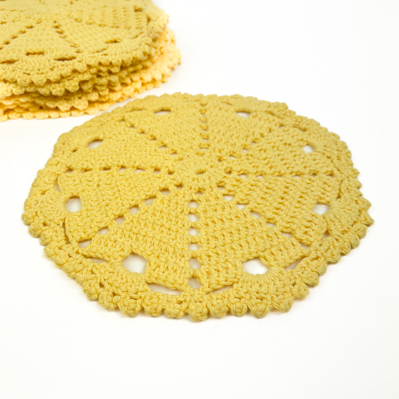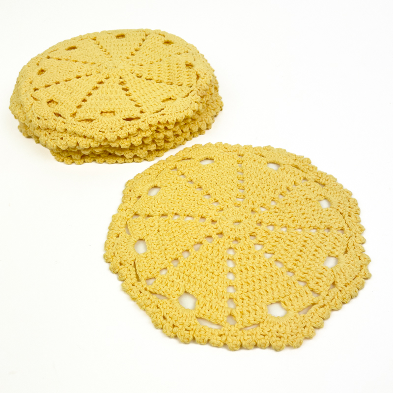 Sæt med tolv fine vintage mellemlægsservietter i klar gul farve med dekorativt hæklet mønster.