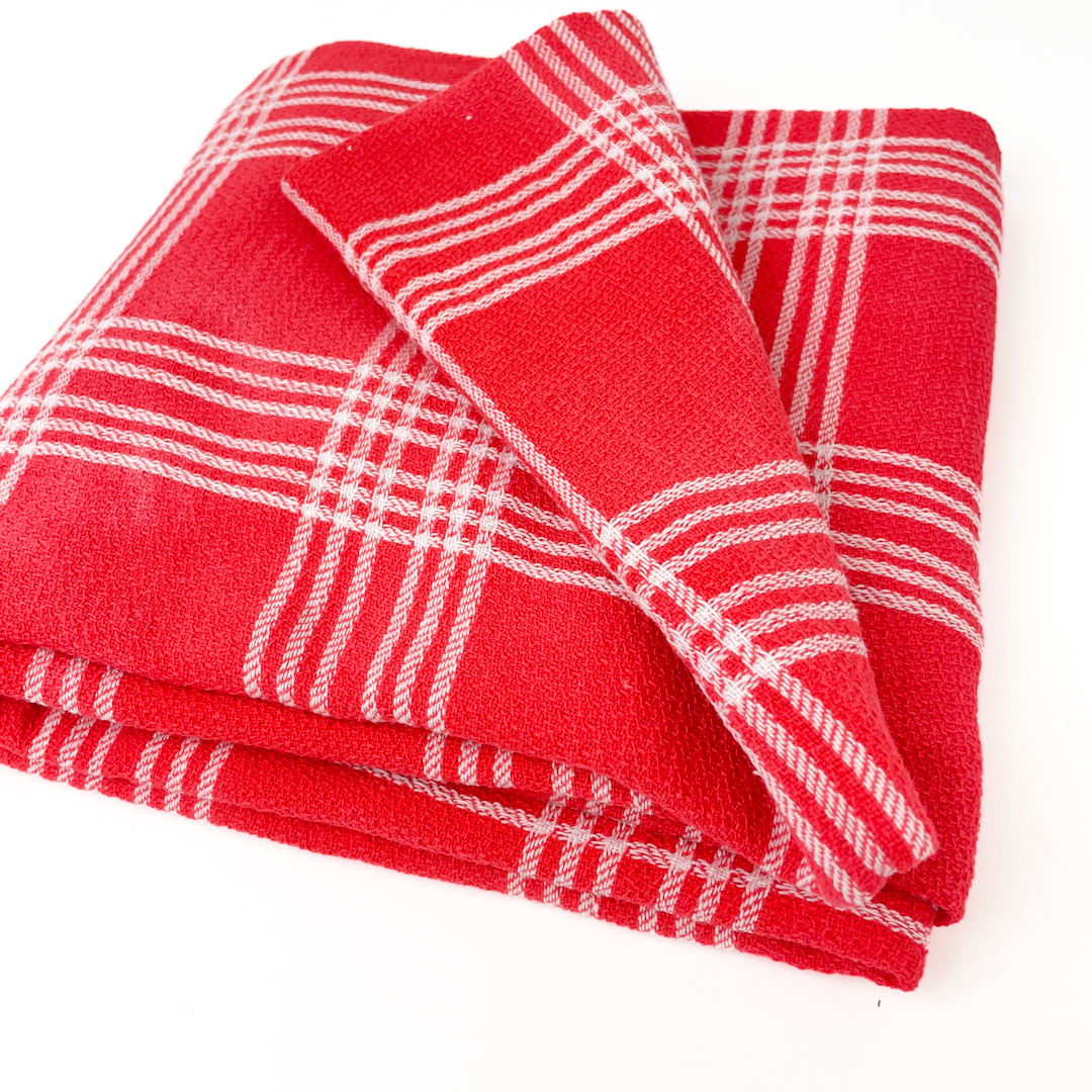 Smuk kraftig dug i klar rød farve med hvide vævede tern og dekorativ bort hele vejen rundt.