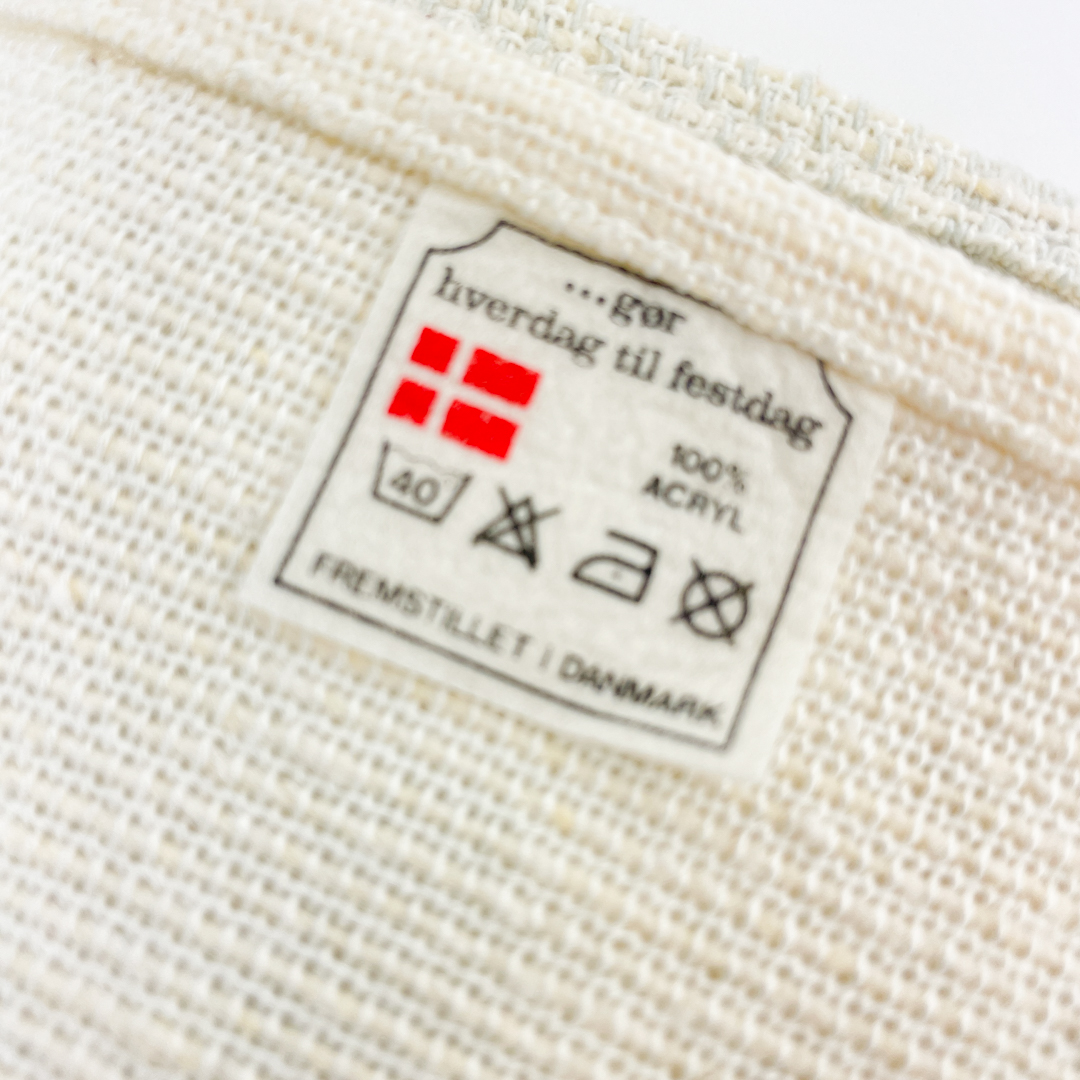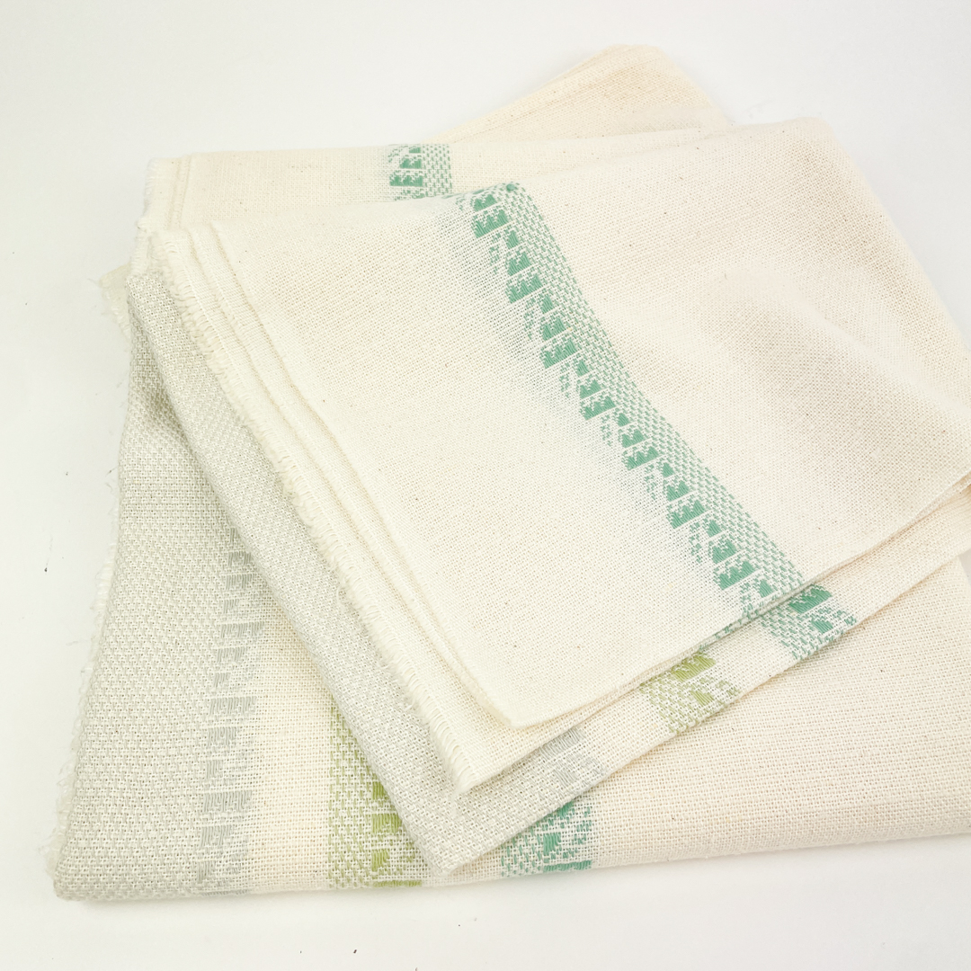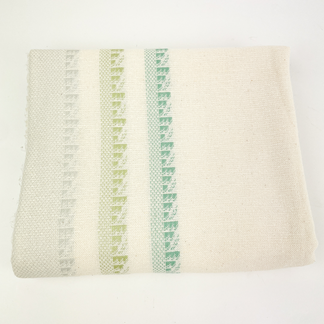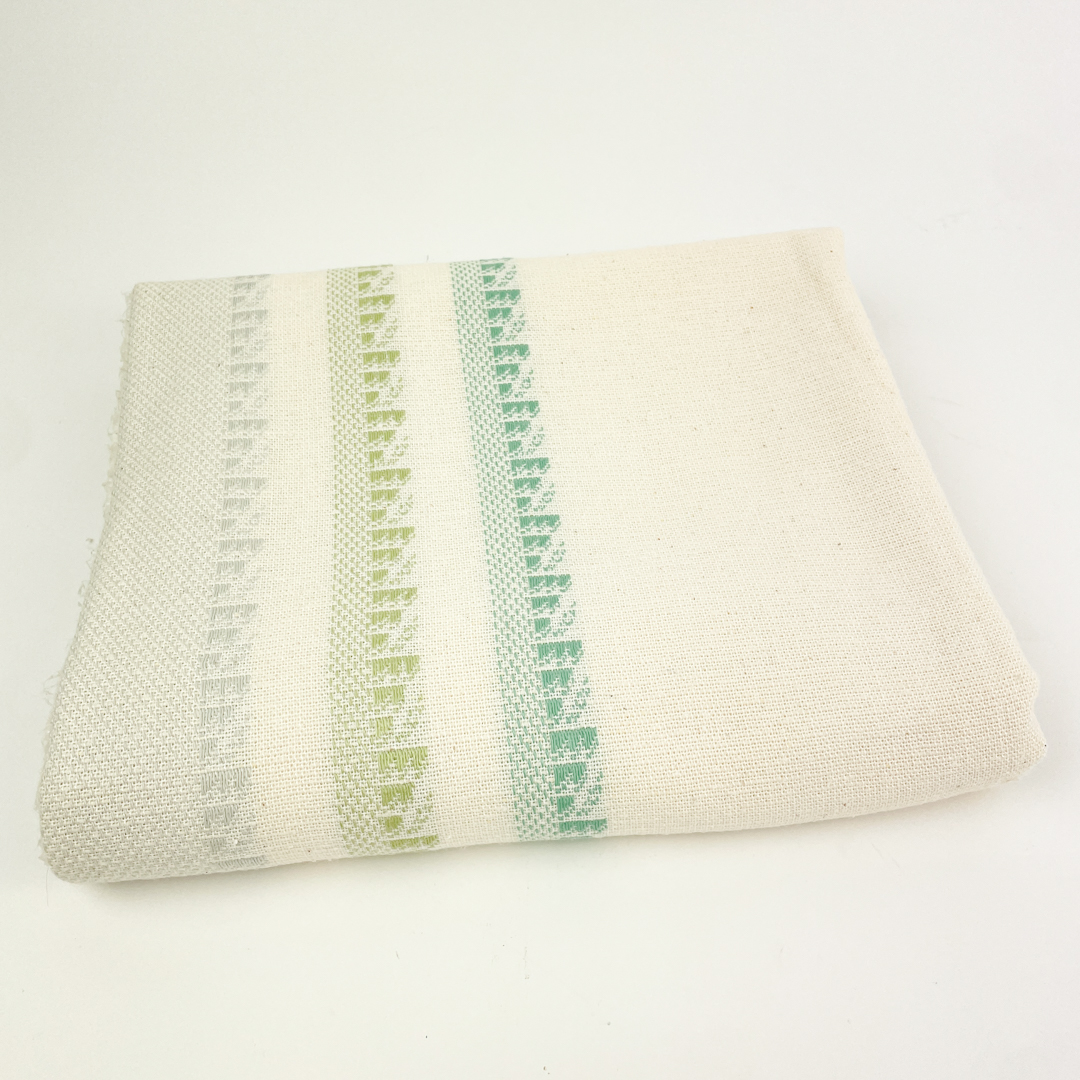 Dugen er vævet i hvidt stof med diskrete grønne og lyse mønstrede borter.