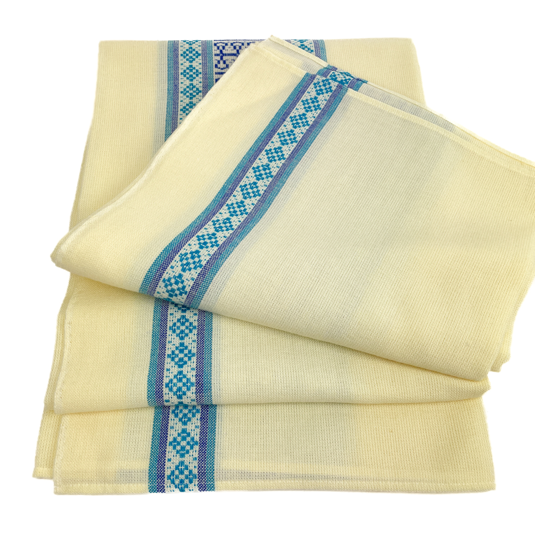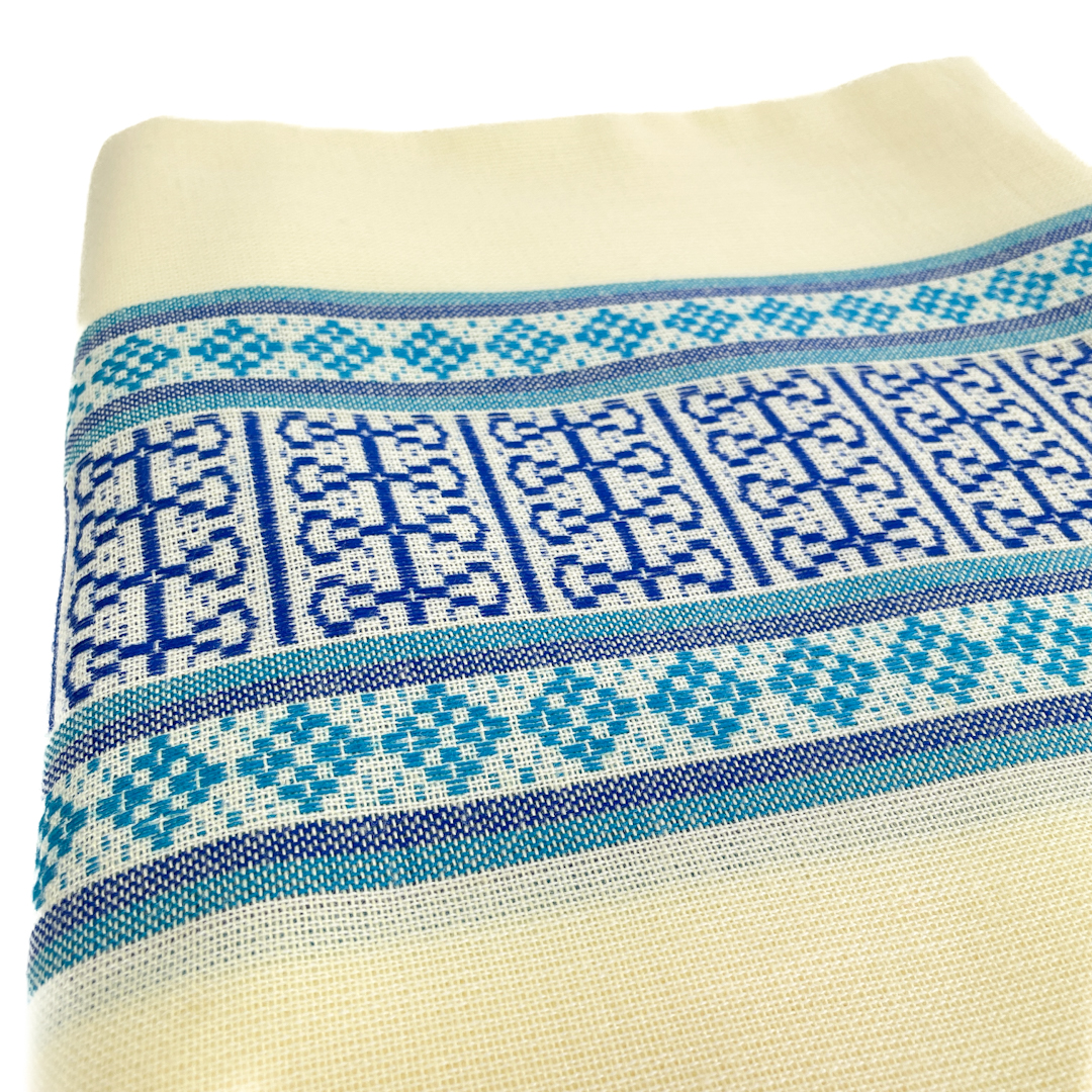 Dugen er lys beige med en bred, og super flot bort i blå og turkis ned langs midten.