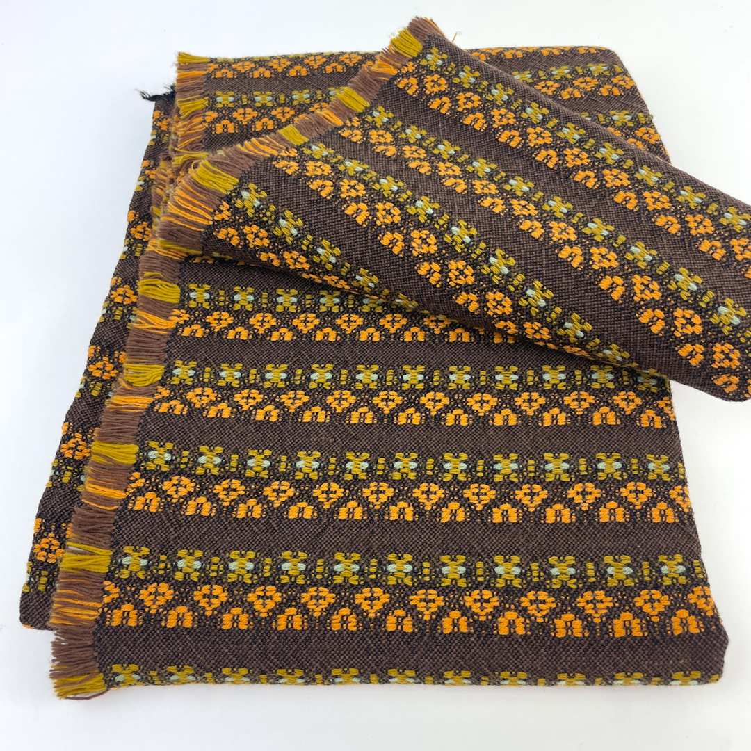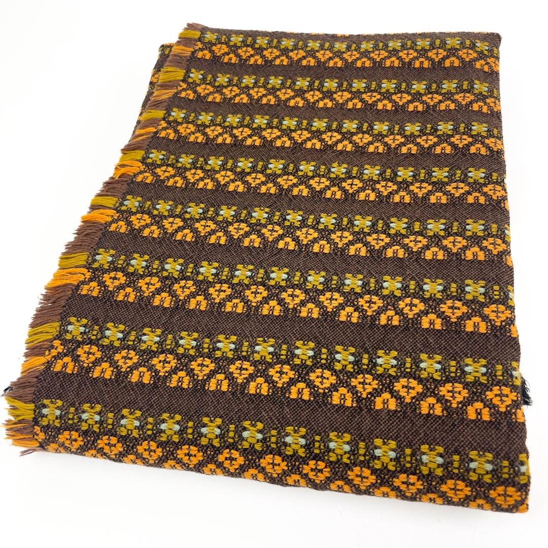 Flot vævet dug i mørk bundfarve med striber i orange og olivengrøn.